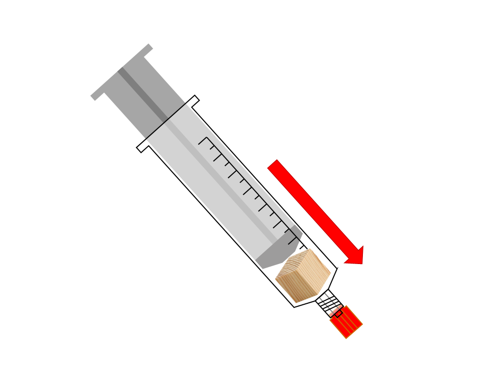 Nimm den Stempel aus der Spritze. Lege den Würfel in die Spritze. Mache alle Luft heraus. Drücke fest. Kann man den Würfel zusammendrücken?
