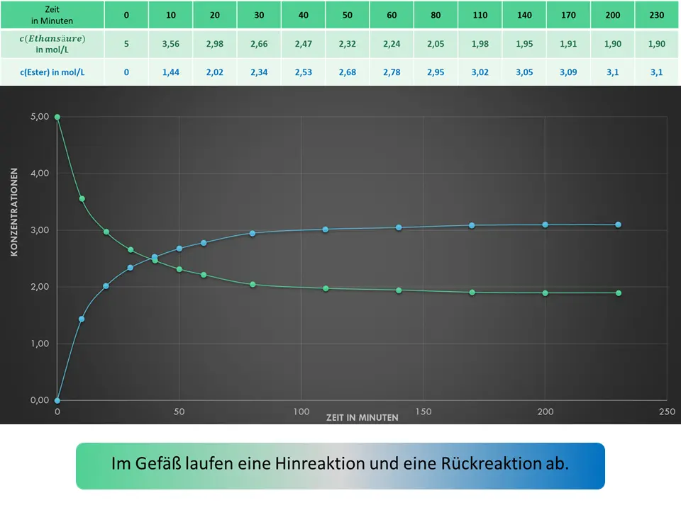 Es laufen also eine Hinreaktion (Esterbildung) und eine Rückreaktion (Esterspaltung, Bildung von Ethansäure) ab!