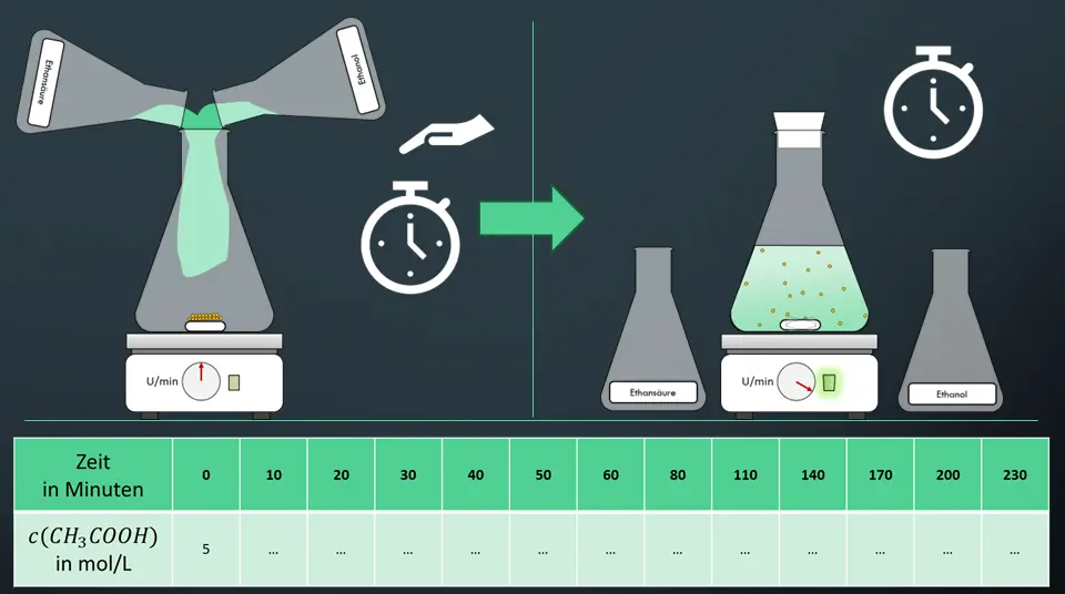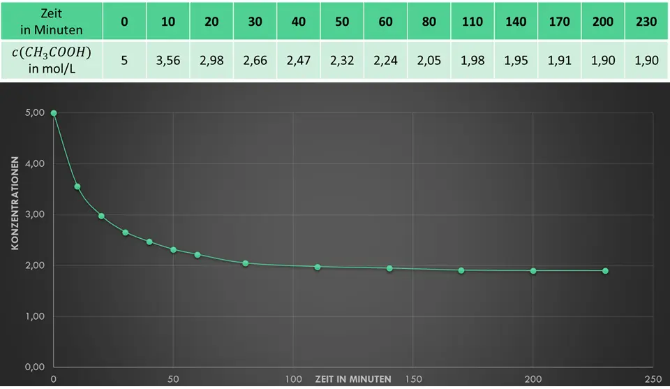 Die Anfangskonzentration der Ethansäure und die Anfangskonzentration von Ethanol sind gleich. Sie beträgt jeweils 5 mol/L.3. Damit ist sichergestellt, dass die gesamte Ethansäure reagieren kann.