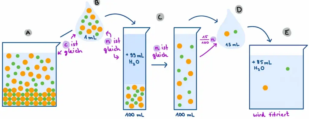 D.h. im Becherglas (E) waren folglich 0,0009 mol Chlorid-Teilchen enthalten. Diese Stoffmenge ist gleich der Stoffmenge an Chlorid-Teilchen in den zuvor von der Verdünnung entnommenen 15 mL (D). Die Stoffmenge in (C) lässt sich wie folgt berechnen:
