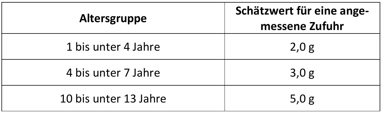 Empfehlungen zur maximalen täglichen Speisesalzzufuhr. Erwachsene und Kinder. Die Werte für Kinder stammen von der DGE. Die Empfehlungen der AHA und der WHO beziehen sich in den Originalquellen primär auf die Aufnahme von Natrium. Für diese Tabelle wurden die Werte in die entsprechende Menge Speisesalz (NaCl) umgerechnet. 4567