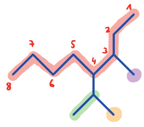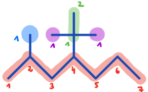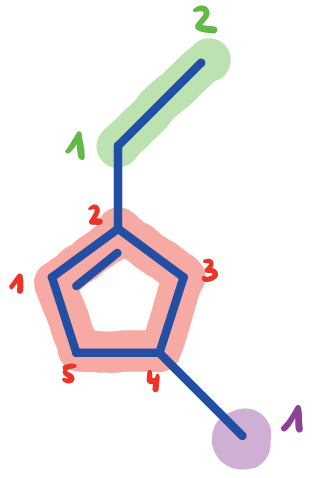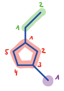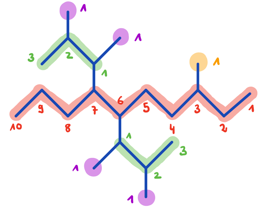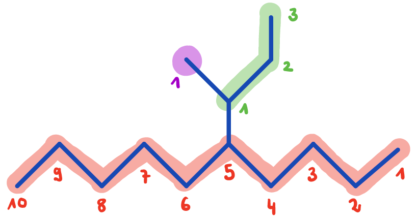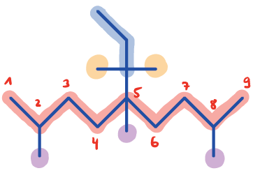 - Die Seitenkette wird zunächst als eigenständige Verbindung betrachtet ohne Kontakt zur Hauptkette. Innerhalb der verzweigten Seitenkette wird die längste Kohlenstoffkette gesucht ausgehend von dem Kohlenstoffatom, das an der Hauptkette gebunden ist.
