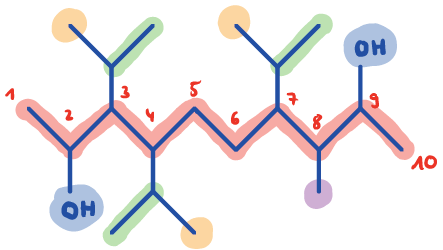 Manchmal kann es vorkommen, dass sich beim Festlegen der Hauptkette ein Auftauchen einer verzweigten Seitenkette nicht vermeiden lässt. In so einem Fall gelten die folgenden Regeln: