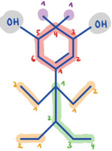 - Enthält die verzweigte Seitenkette im Namen Zählwörter (Di, Tri, Tetra…) so werden diese bei der alphabetischen Einordnung im Gesamtnamen des Moleküls berücksichtigt (siehe Abb. 3).