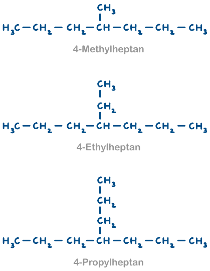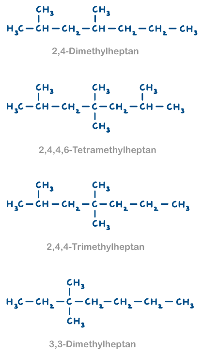 - Die Benennung der Seitenketten erfolgte nicht in alphabetischer Reihenfolge. Zudem existieren zwei identische Seitenketten, die mit einem Zählwort im Namen zusammengefasst werden müssen. Es müsste heißen 4-Ethyl-2,5-dimethylheptan.