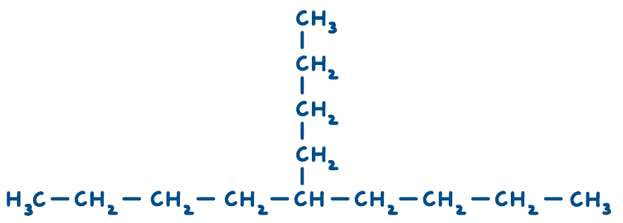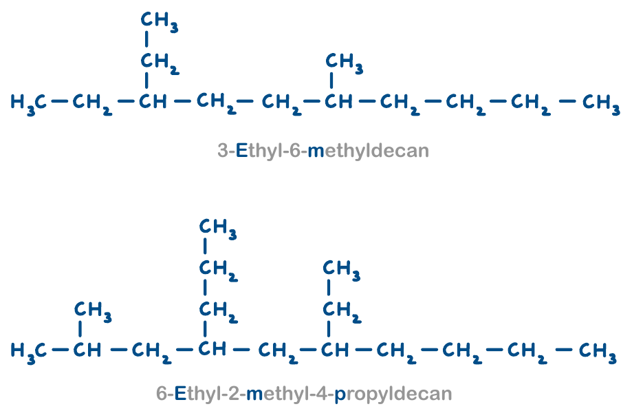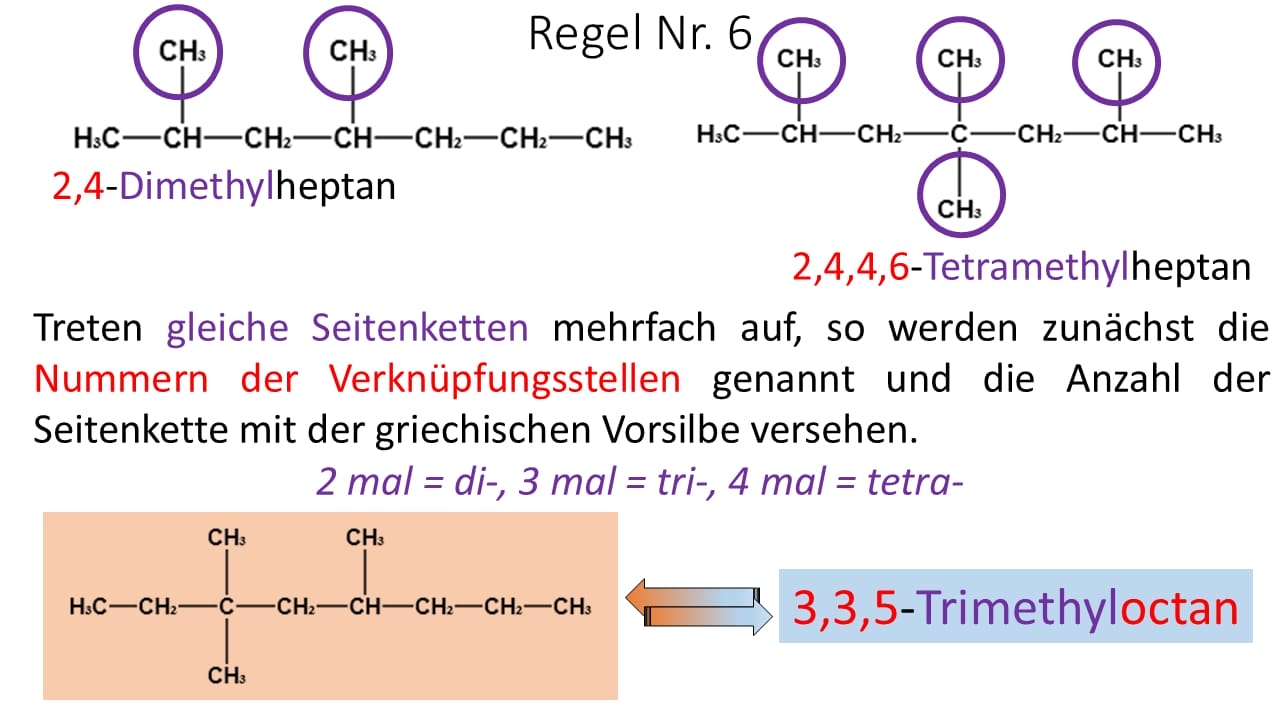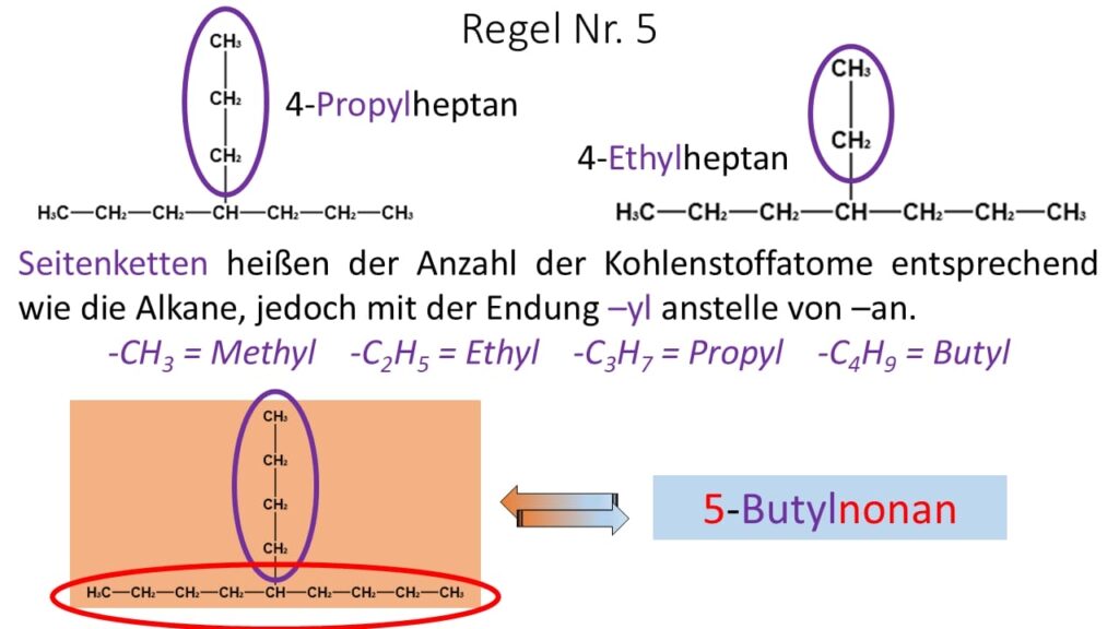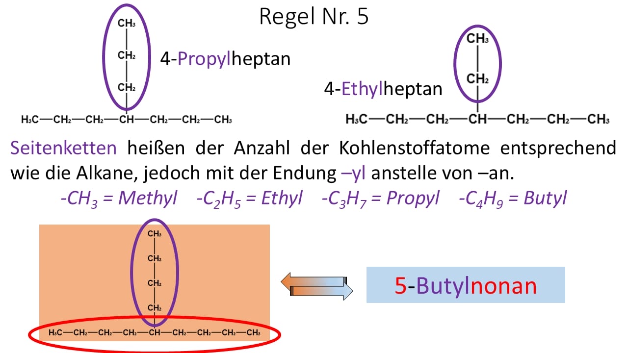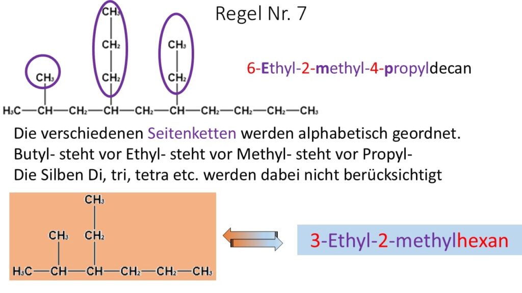 - Bei der Durchnummerierung der längsten Kohlenstoffkette wurde nicht darauf geachtet, dass die Seitenketten möglichst kleine Zahlen erhalten. Es wurde von links gezählt. Wird von rechts gezählt lautet der Name 6-Ethyl-3-methyl-4-propylnonan.