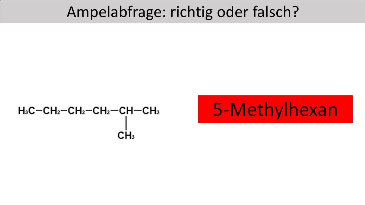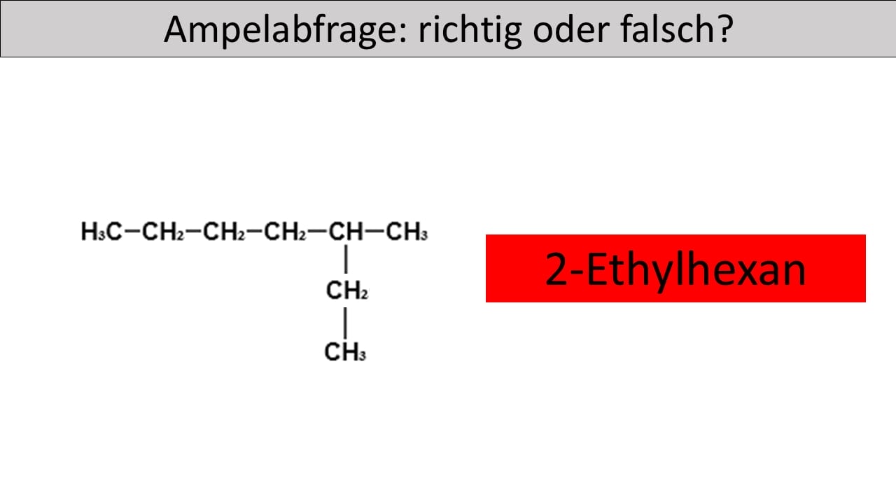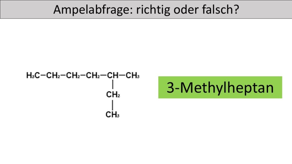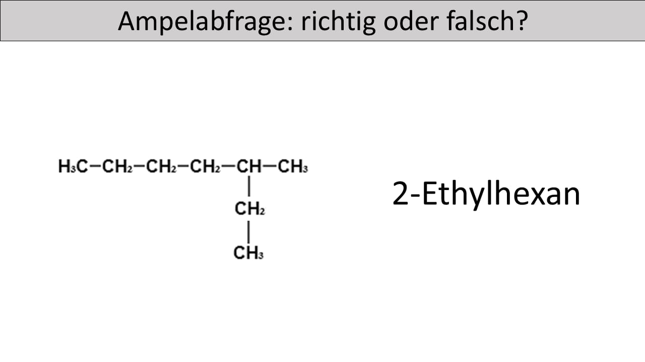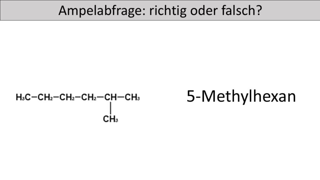 - Die längste Kohlenstoffkette bildet den Stammnamen „hexan“ und nicht pentan. Die Seitenkette befindet sich nicht am zweiten sondern am dritten Kohlenstoffatom der längsten Kette. Zudem ist die Seitenkette keine Ethylgruppe, sondern eine Methylgruppe.