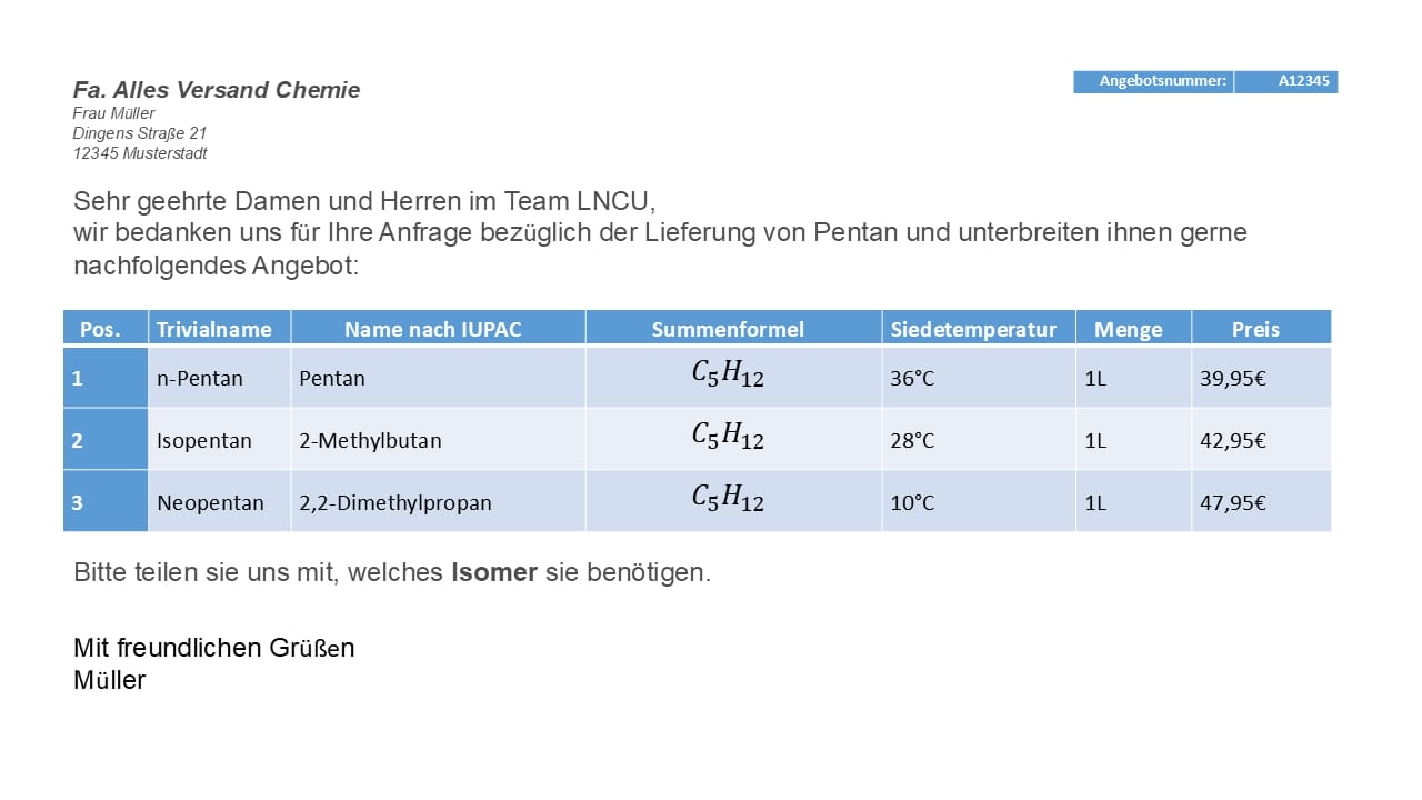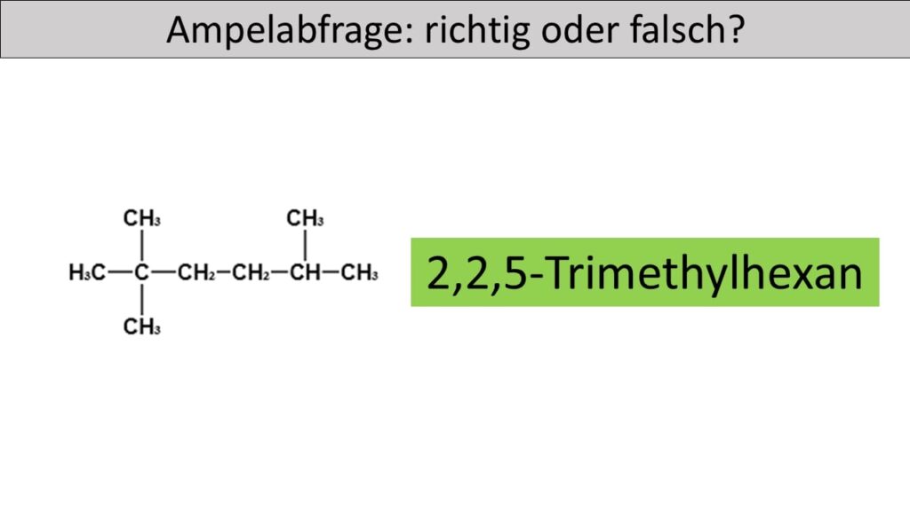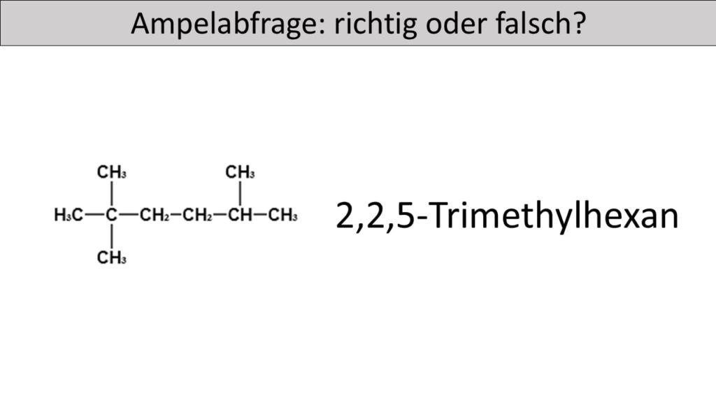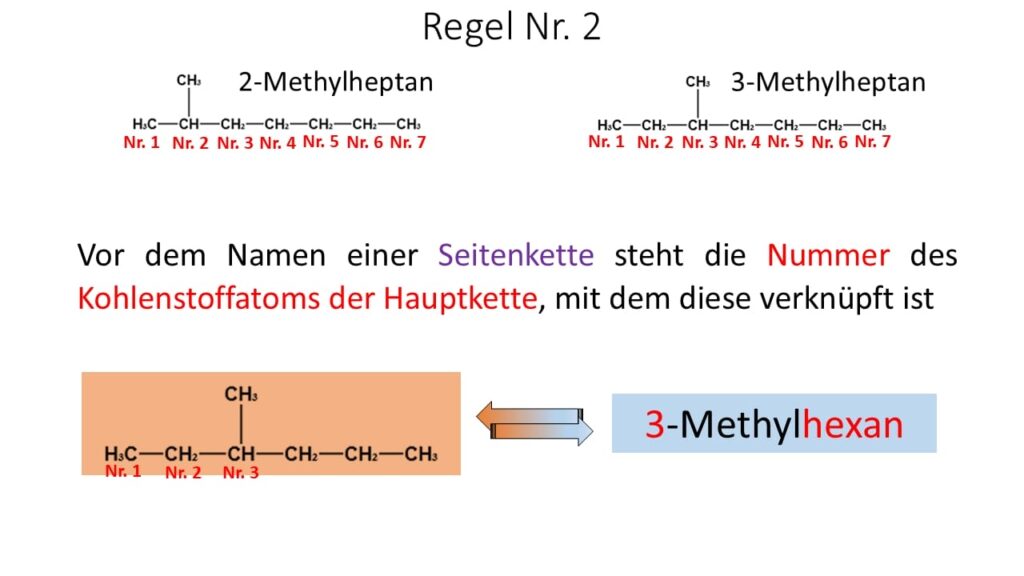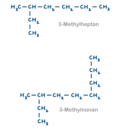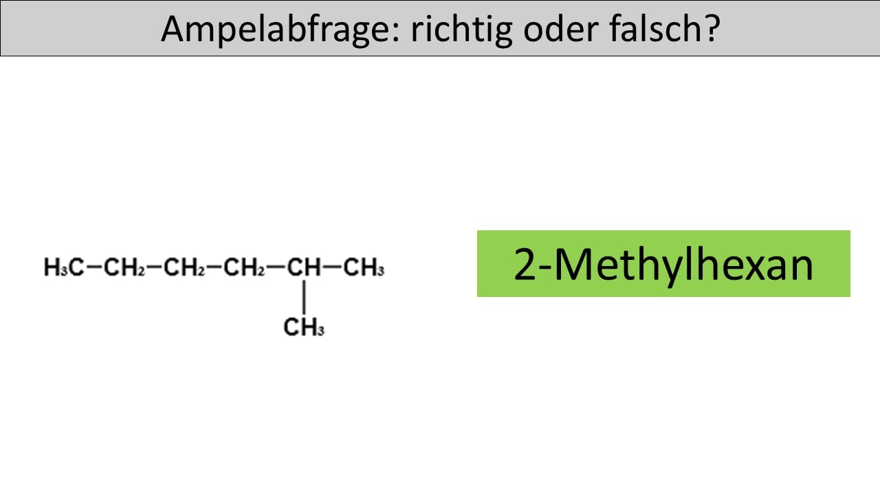 - Die längste Kohlenstoffkette bildet den Stammnamen „hexan“ und nicht pentan. Die Seitenkette befindet sich nicht am zweiten sondern am dritten Kohlenstoffatom der längsten Kette. Zudem ist die Seitenkette keine Ethylgruppe, sondern eine Methylgruppe.