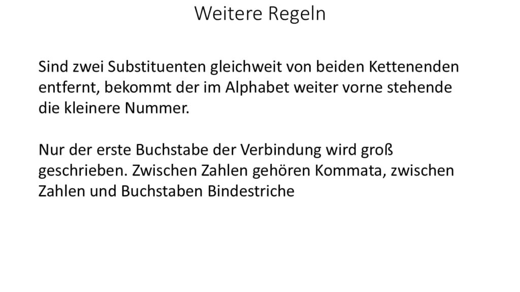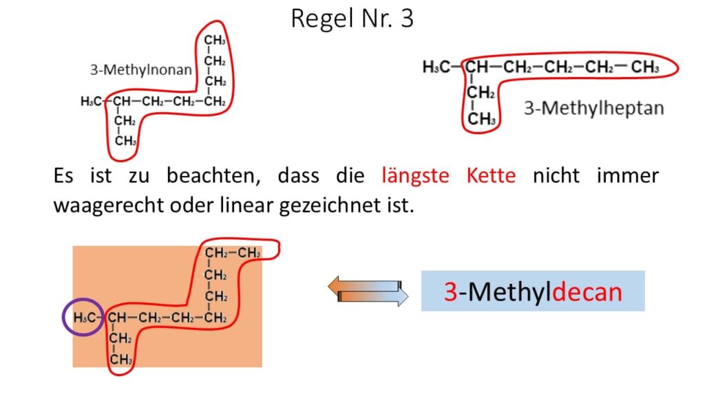 - Notieren Sie unter der Überschrift „Zusammenfassung der Nomenklatur-Regeln“ die erste Regel: „Die längste, ununterbrochene Kohlenstoffkette ergibt den Stammnamen einer Verbindung und wird am Ende des Namens einer Verbindung notiert.“