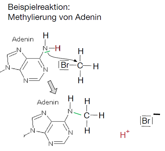 - Formulieren Sie mit Hilfe von M3 für eine Reaktion zwischen einer DNA-Base und Brommethan die Reaktion mit Strukturformeln.