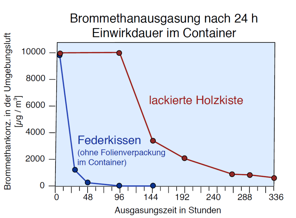 Brommethan kann während der langen Transportwege in die Waren, die in den begasten Containern transportiert wurden, eindringen. Dies birgt mögliche Gefahren für den Verbraucher, da aus den gekauften Produkten (Textilien, Leder, Holzprodukte) noch Brommethan austreten kann. Untersuchungen des TÜVs Rheinland zum „Ausgasen“ von Brommethan aus diversen Produkten aus begasten Containern führten u.a. zu den in Abb. 5 dargestellten Messergebnissen.