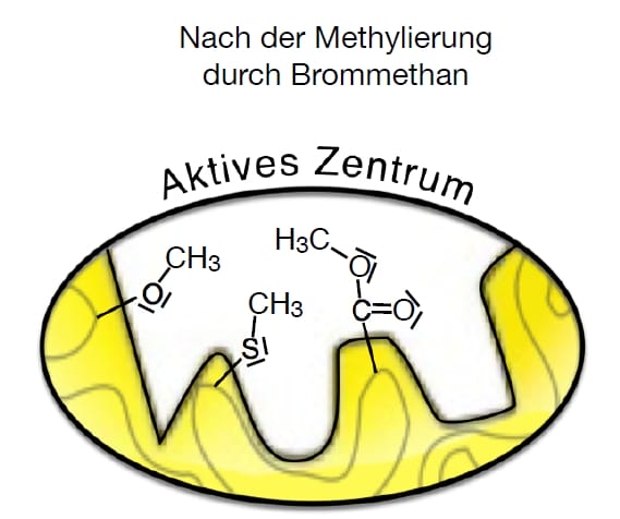 Denken Sie darüber nach, wie des aktive Zentrum nach Kontakt mit Brommethan aussähe.