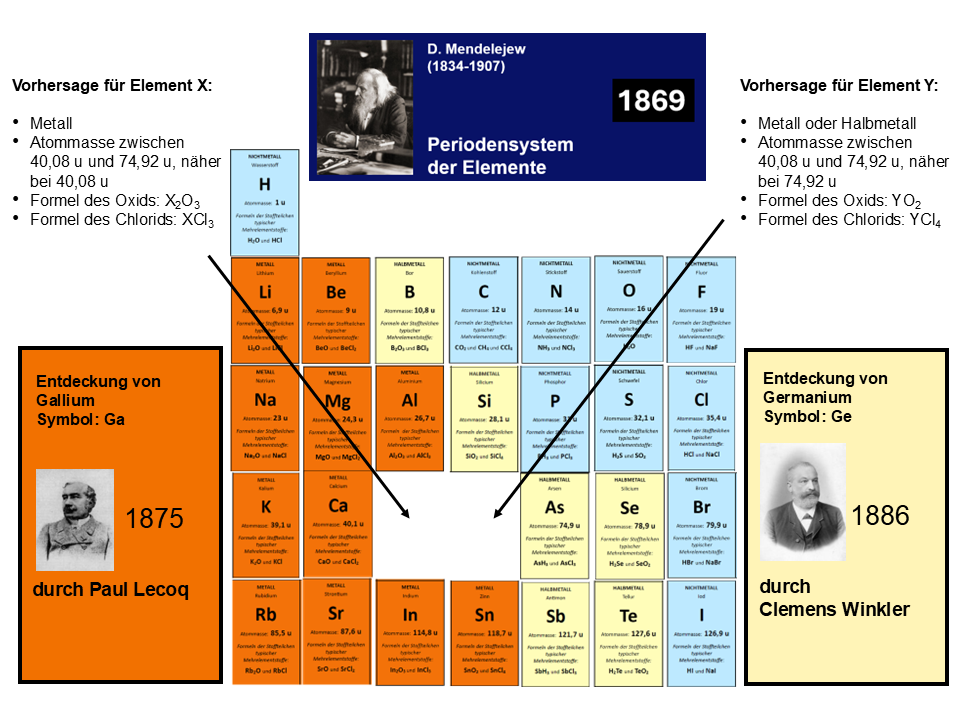 Die Fachwelt war skeptisch gegenüber Mendelejews Behauptungen und Prophezeiungen. Aber 1875 entdeckte der französische Chemiker Lecoq tatsächlich ein passendes neues Element, das er Gallium (Ga) nannte. 1886 entdeckte der Deutsche Winkler dann ein weiteres passendes, und gab ihm den Namen Germanium (Ge).