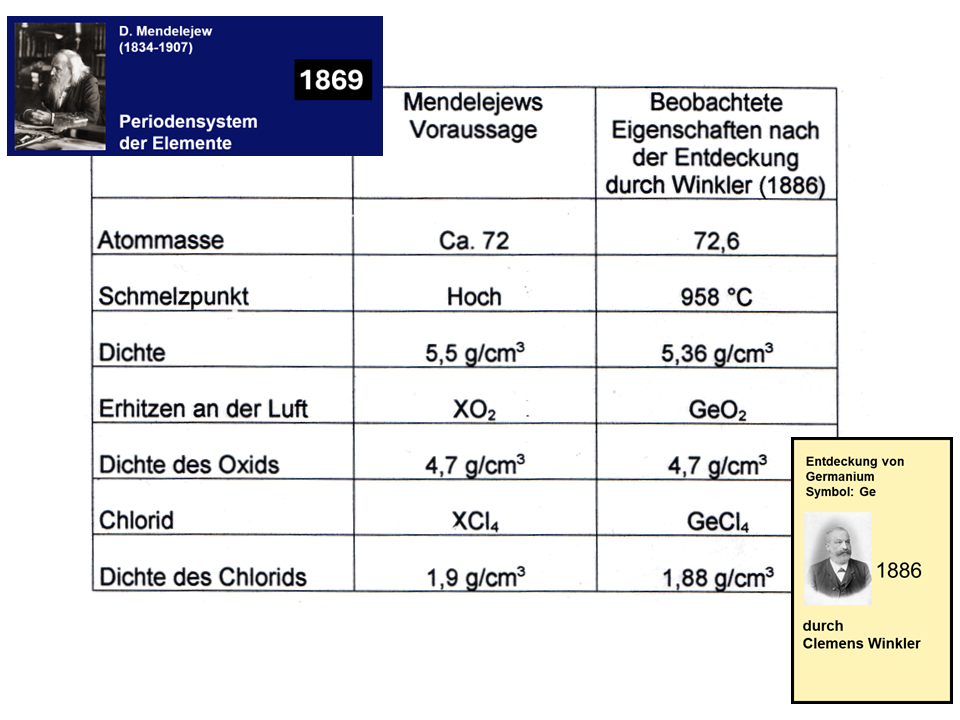 Inwiefern Mendelejews Vorhersagen zum Germanium passten, kannst Du selbst überprüfen: