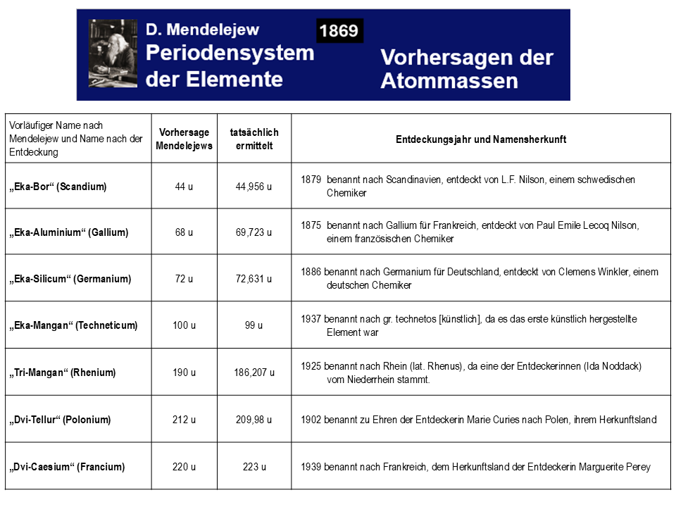 Als Mendelejew 1869 sein „Periodensystem der Elemente“ erstmals der Öffentlichkeit vorstellte, waren 63 Elemente bekannt. Auch sein Periodensystem zeigte Lücken. Mendelejew sagte vorher, dass eines Tages hier passende neue Elemente gefunden würden und er benannte Eigenschaften basierend auf den Eigenschaften benachbarter Elemente.