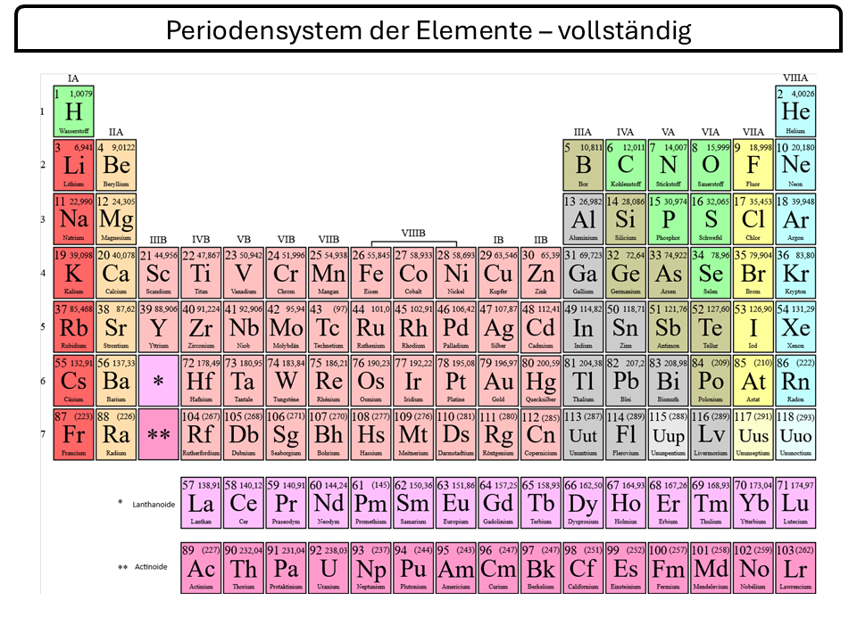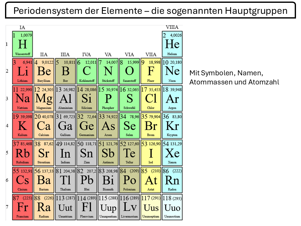 Wie es zu den Ähnlichkeiten der Elemente einer „Gruppe“ kommt und warum sich heutzutage evtl. noch zu entdeckende Elemente nicht an beliebiger Stelle einreihen können, werden wir erklären können, wenn wir einen genaueren Blick „in“ die Atome geworfen haben werden.