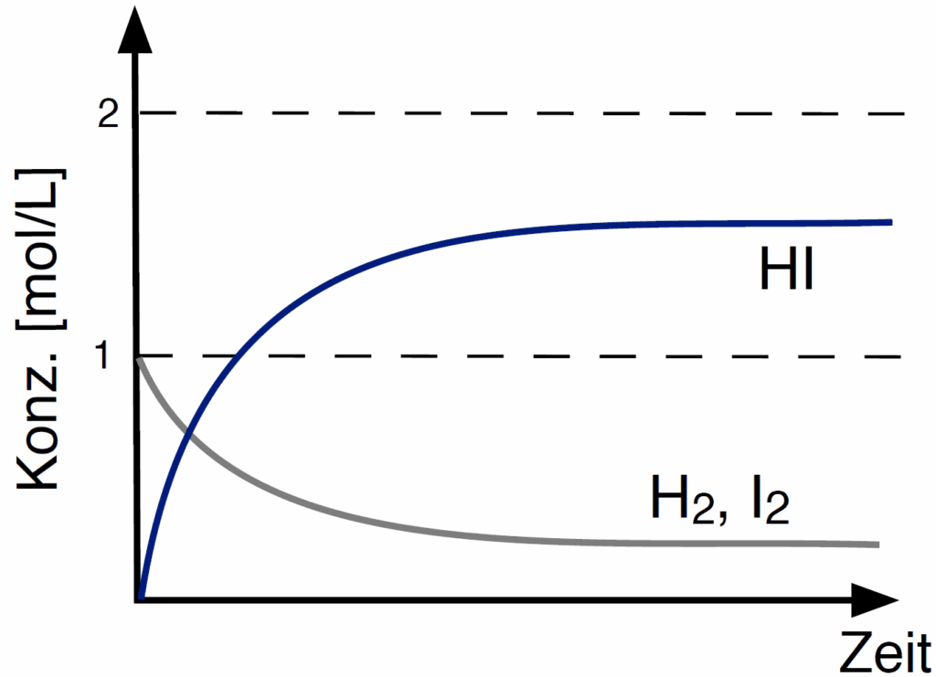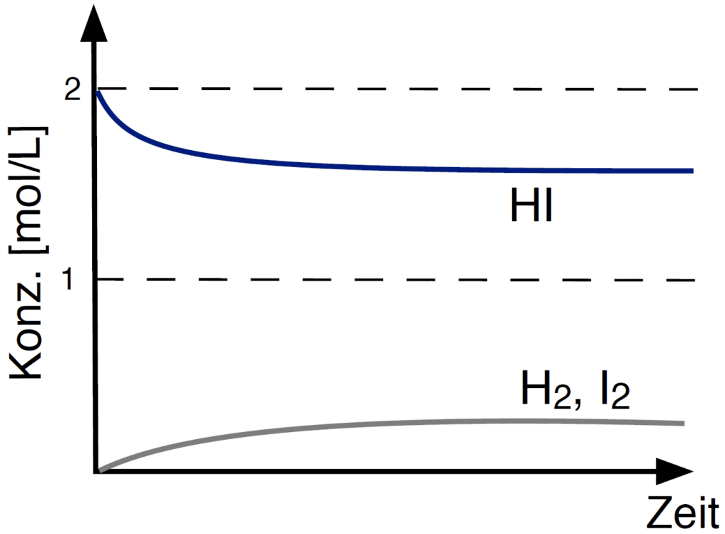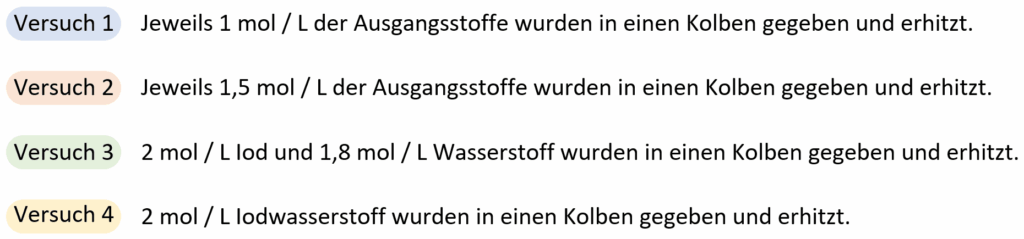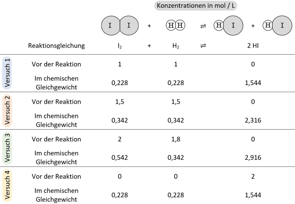 Da es sich in M1 um Konzentrationen von Iod, Wasserstoff und Iodwasserstoff im Gleichgewicht handeln, ist zu erwarten, dass für alle Versuche derselbe Wert für die Gleichgewichtskonstante K herauskommt. Aber warum ist das so?