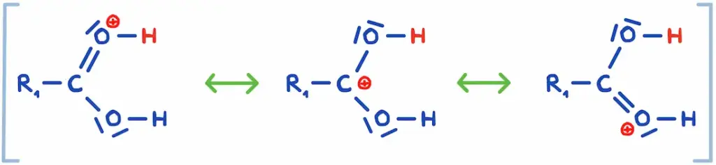 Drei mesomere Grenzformeln am Beispiel einer Zwischenstufe bei der Veresterung. 2