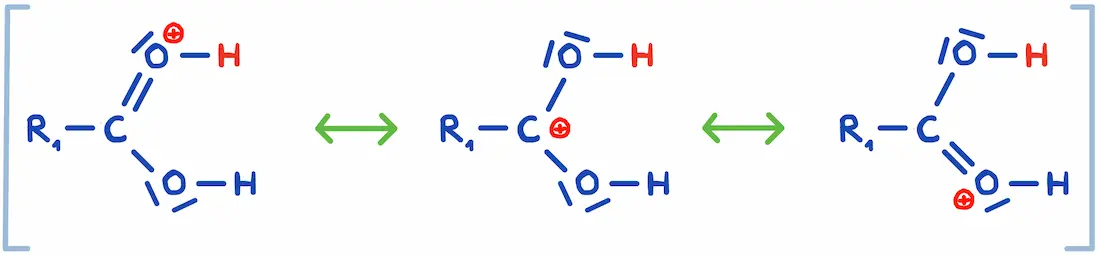 Drei mesomere Grenzformeln am Beispiel einer Zwischenstufe bei der Veresterung. 2