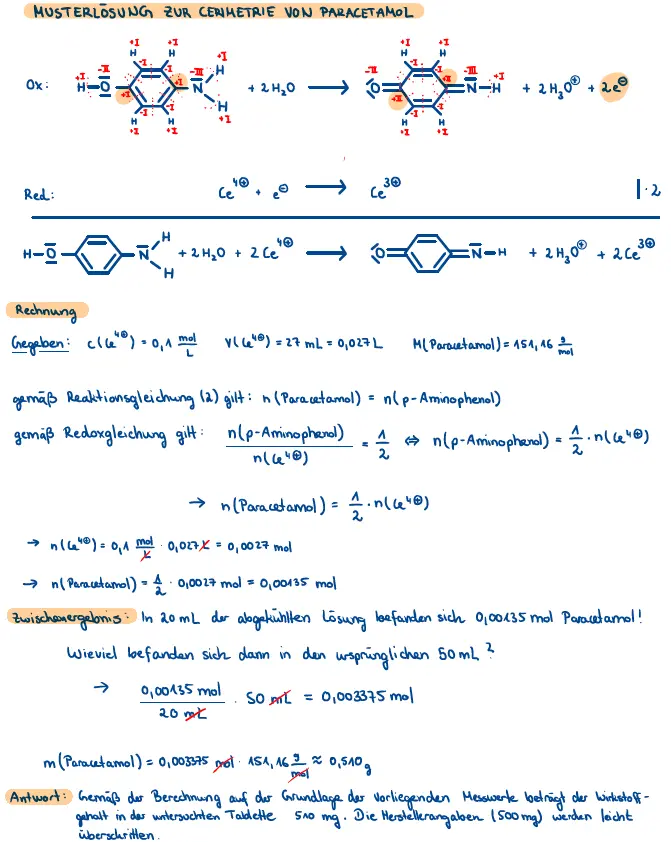 Das Ende der Redoxtitration wird im Falle von Paracetamol durch die Zugabe geringer Mengen Ferroin, einem Redoxindikator, ermittelt. Während der Titration wird er selbst durch die Cer(IV)-Ionen oxidiert und ändert so seine Farbe von Rot nach Blau. Da er nur in geringen Mengen zugeführt wird, kann sein Einfluss auf die benötigte Menge an Maßlösung (hier Ammoniumcer(IV)sulfat) vernachlässigt werden.