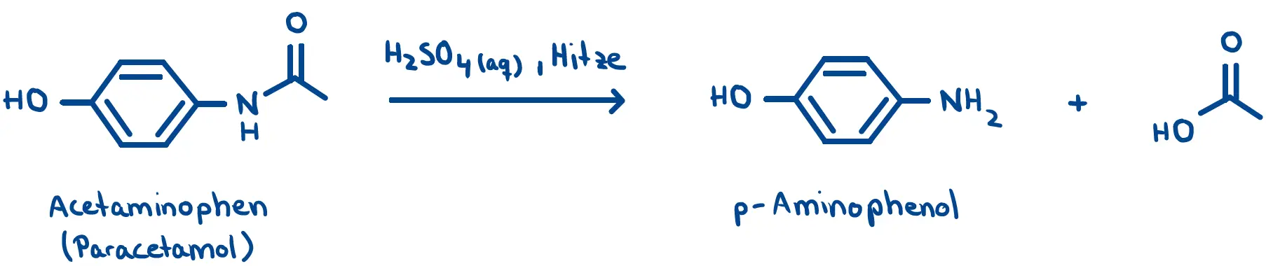 Der Gehalt des Wirkstoffes in einer Paracetamol-Tablette kann nicht direkt bestimmt werden, wohl aber das Spaltprodukt p-Aminophenol. Hierzu wird eine zermahlene Tablette in verdünnter Schwefelsäure erhitzt. Als Nebenprodukt entsteht Essigsäure: