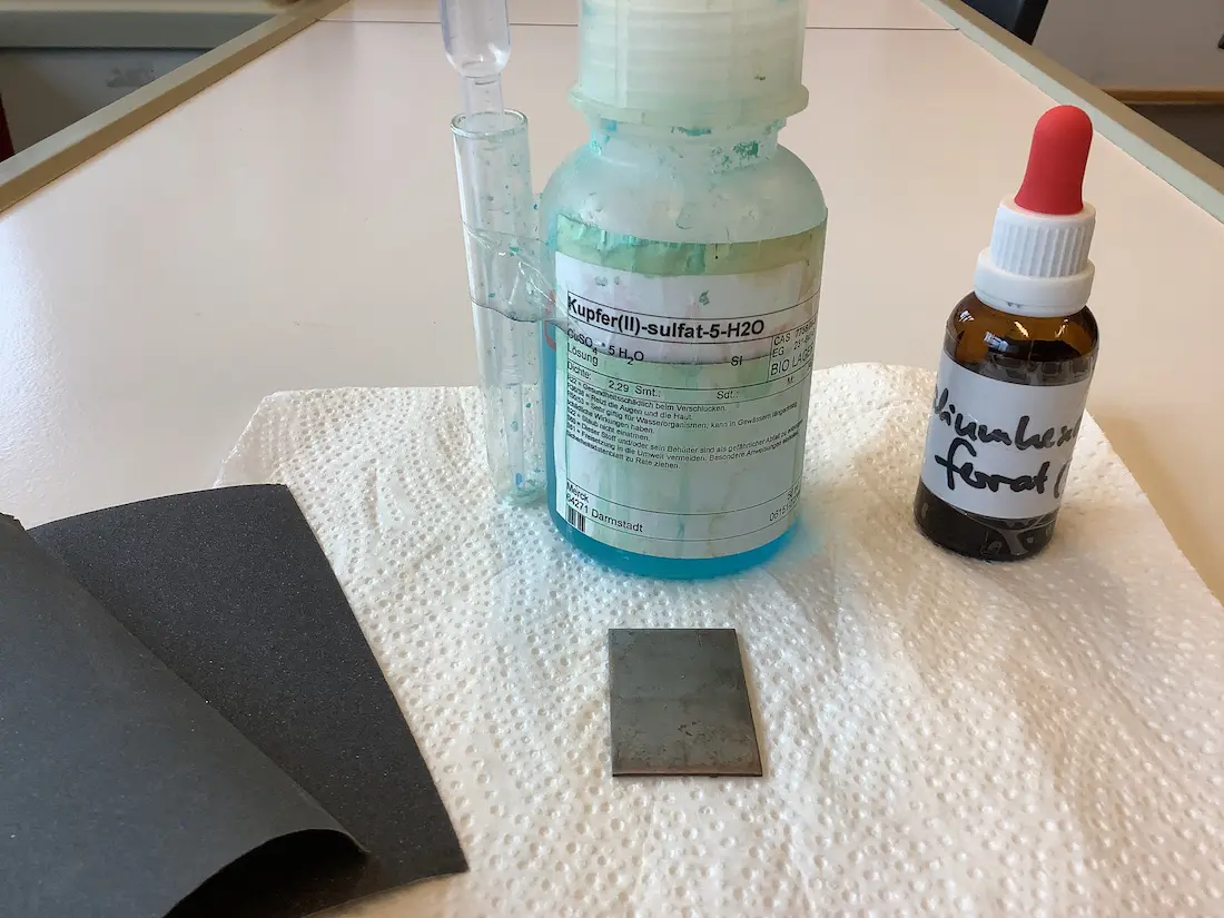 3. Planen Sie einen einfachen Versuch, der ihre Vermutung bezüglich der Abläufe in der Kupfermine stützen oder widerlegen kann. Benennen Sie auch benötigte Chemikalien.