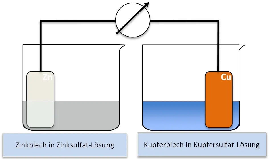 - Mit Hilfe eines Multimeters die elektrische Spannung zwischen den beiden Halbzellen in Volt messen.