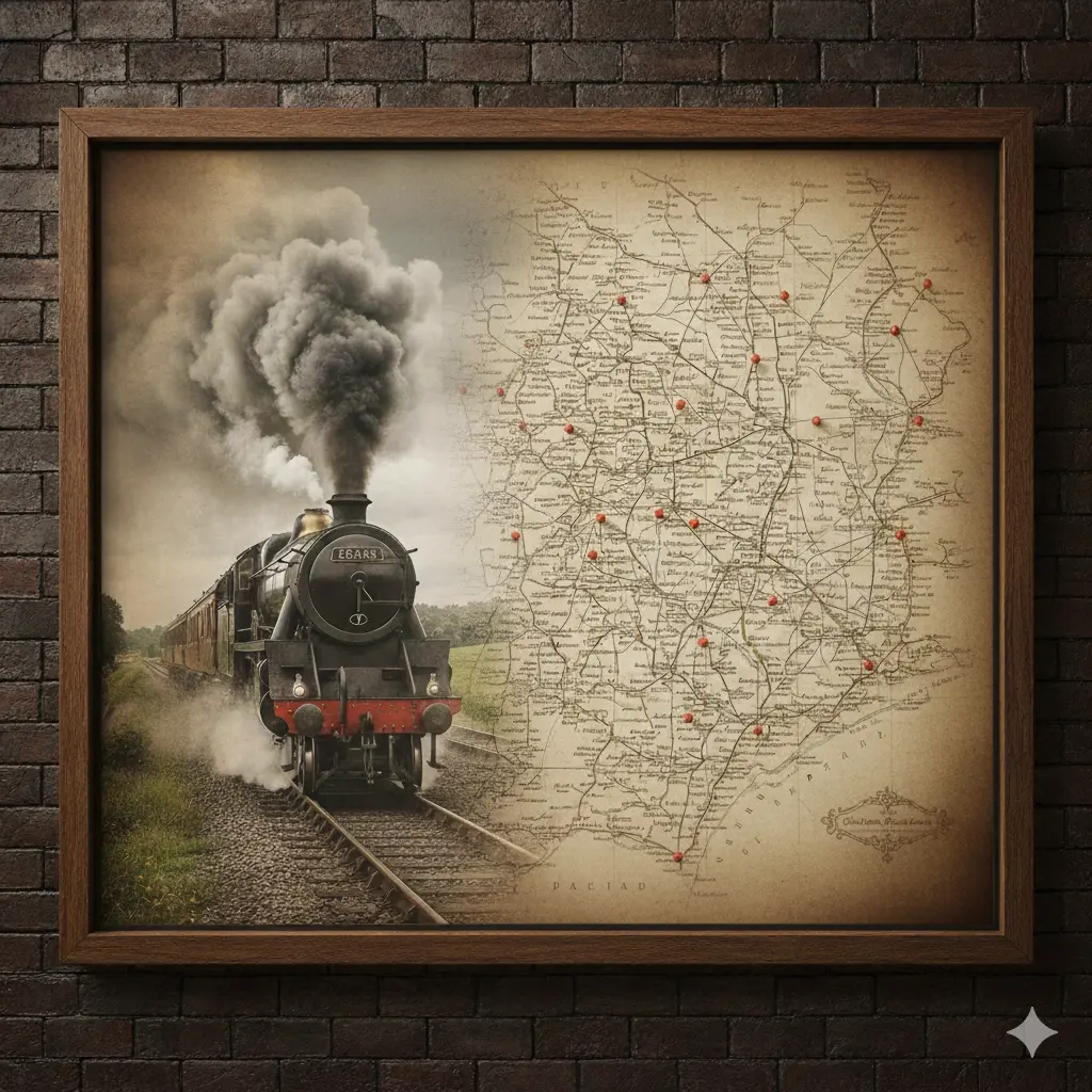Künstlerische Darstellung eines Schienennetzes mit Telegrafen-Stationen (KI generiert)