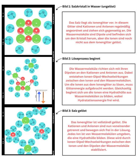 Die Entscheidung für die Arbeit mit Filmleisten dient dazu, den Prozesscharakter des Lösevorgangs für die Schülerinnen und Schüler sichtbar und strukturierbar zu machen. Durch die Darstellung in mehreren aufeinanderfolgenden Bildern wird deutlich, dass es sich beim Lösen eines Salzes nicht um einen punktuellen Vorgang, sondern um einen Prozess handelt, der auf Teilchenebene schrittweise beschrieben werden kann. Insbesondere das mittlere Bild der Filmleiste ermöglicht es den Lernenden, den eigentlichen Übergangszustand des Lösevorgangs zu modellieren und dort konkurrierende energetische Beiträge sichtbar zu machen. Auf diese Weise wird die Aufmerksamkeit gezielt auf den zentralen Erklärungsschritt der Stunde gelenkt.