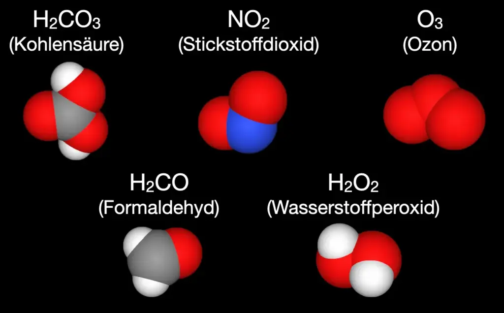 H2CO3-Molekül. Kohlensäure-Moleküle entstehen, wenn CO2 in Wasser geleitet wird (z. B. im Sodastreamer).6