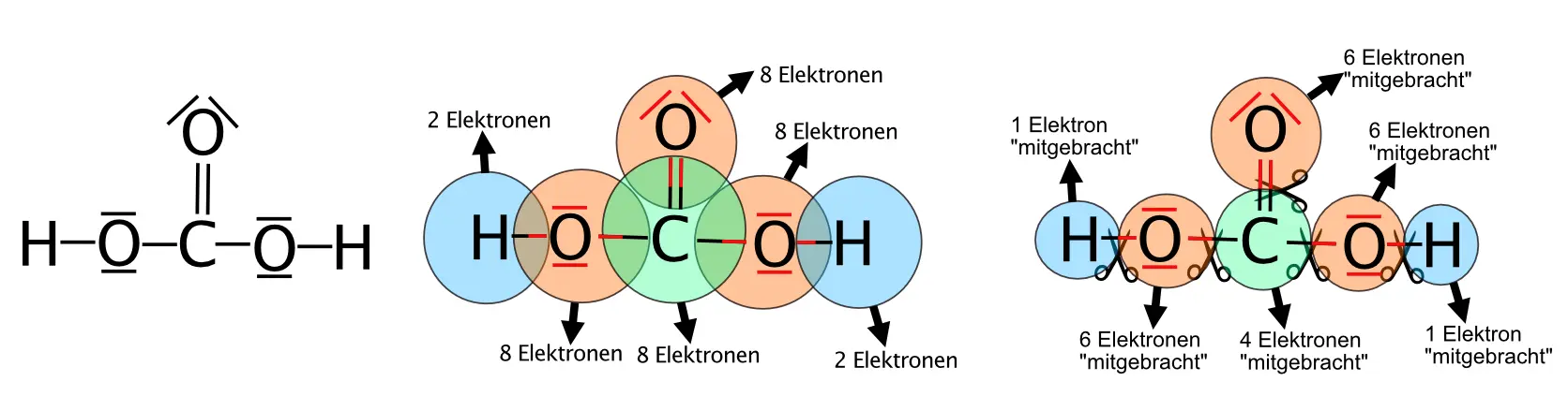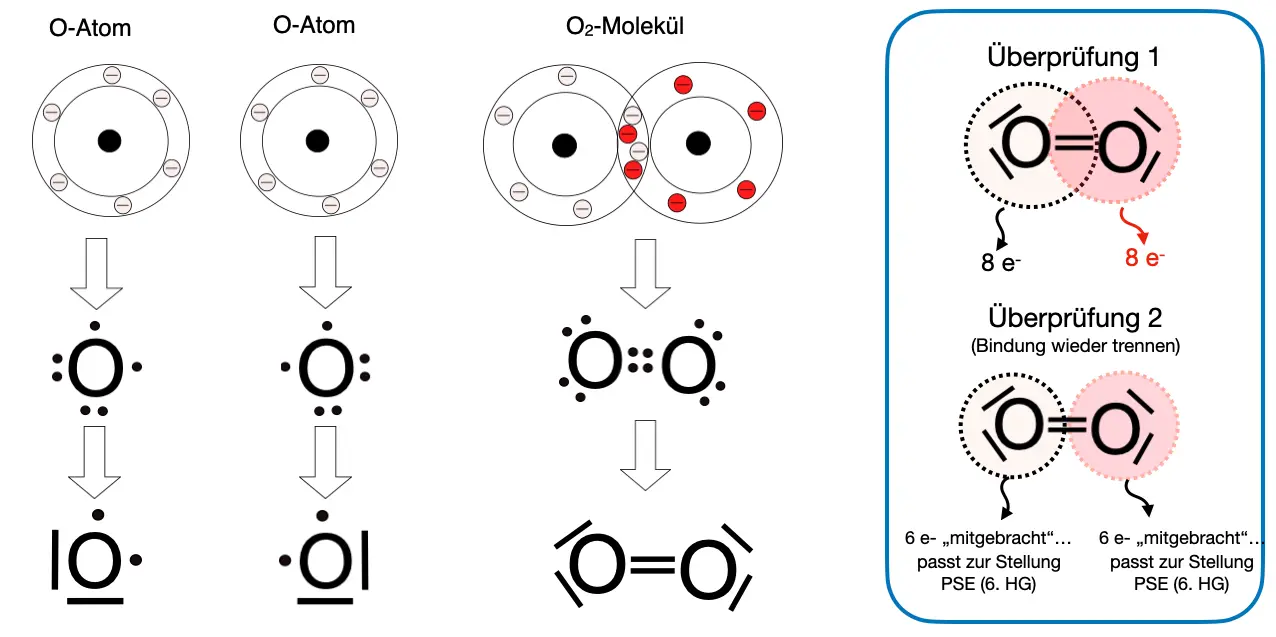 Mit den beiden Überprüfungsschritten kannst Du testen, ob in der gezeichneten Lewis-Formel die äußeren Schalen nicht mehr Elektronen enthalten, als sie aufnehmen können und ob jedes Atom die Anzahl an Elektronen „mitgebracht“ hat, die der Position des Elementes im Periodensystem entspricht.