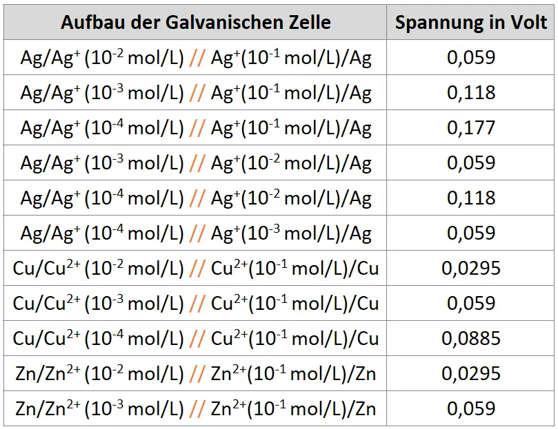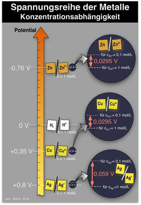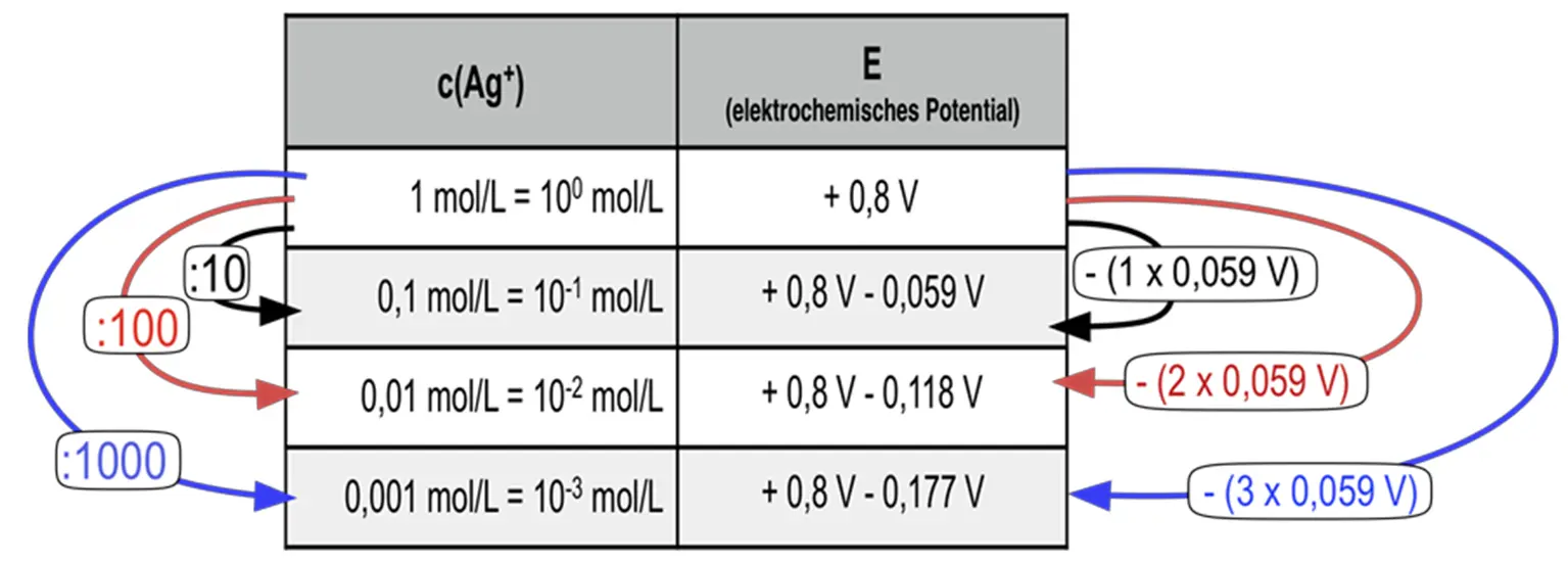 Folglich würde das Elektrodenpotenzial einer Halbzelle nicht nur von der Art des eingesetzten Stoffes, sondern auch von der Konzentration der Stoffe in den Lösungen abhängen.