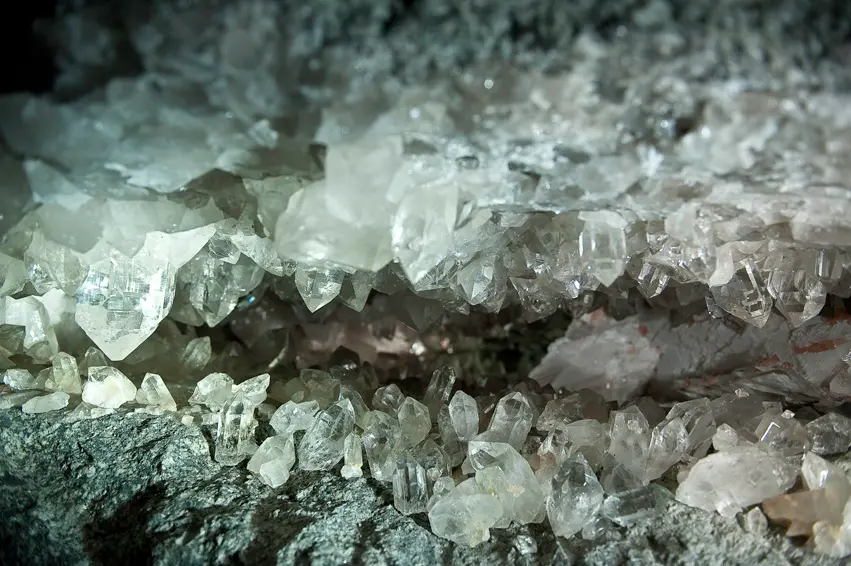 Besonders schöne Kristalle findet man im Gebirge in sogenannten Klüften. Eine Kluft ist ein Spalt im Gestein. Wenn sehr heißes, stark mineralhaltiges Wasser in solche Spalten fließt, abkühlt und dann das Wasser verdunstet, bleiben die zuvor gelöste Stoffe zurück und je nach vorhandenen Ionen wachsen verschiedene Kristalle.