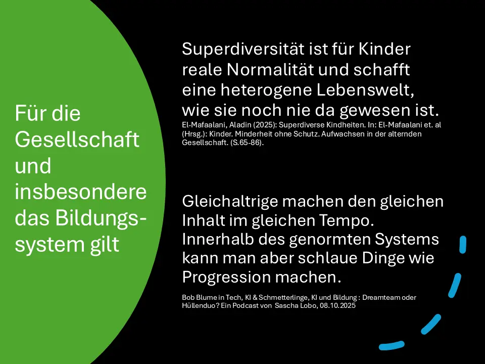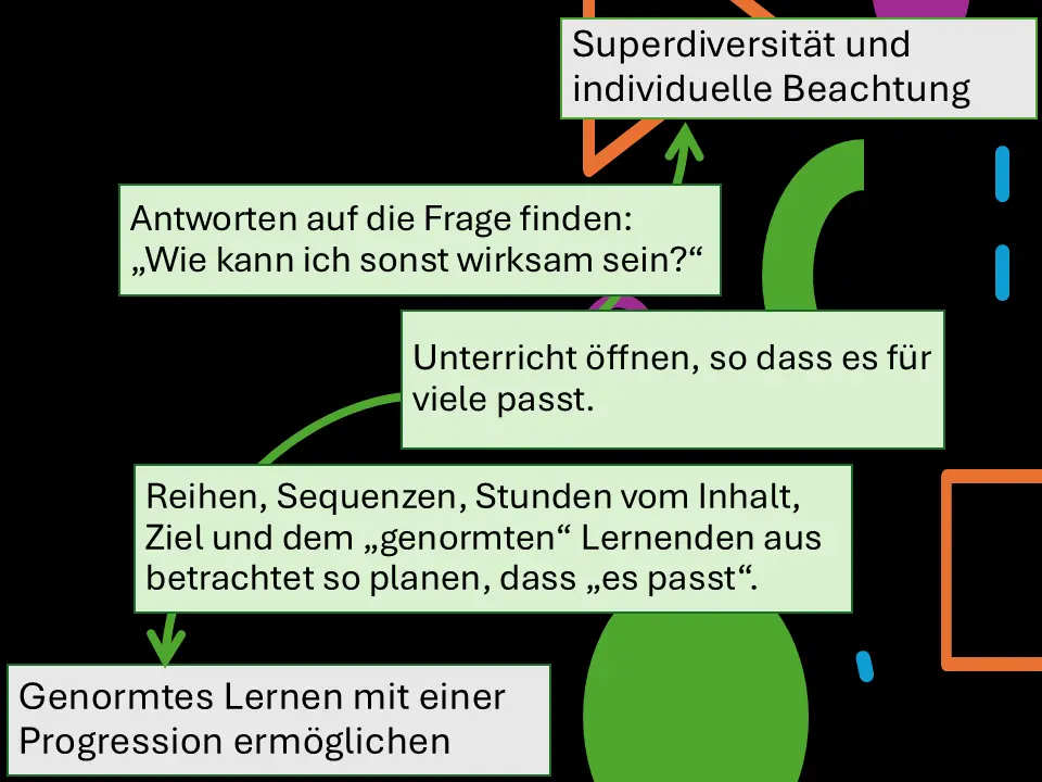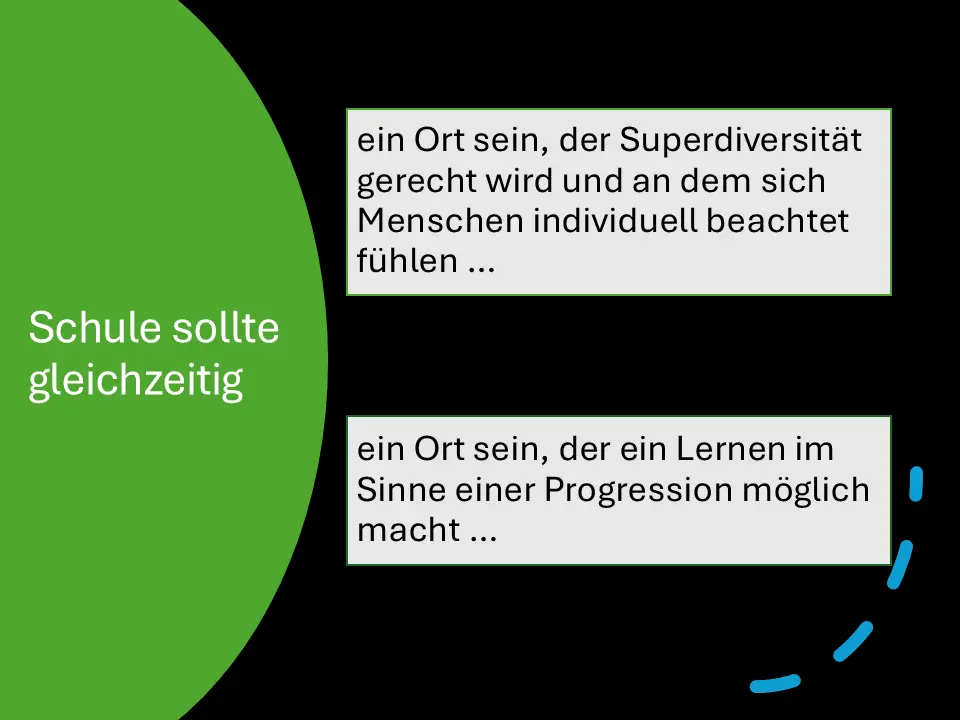 Ich denke, auf der einen Seite bedarf es eine normierten Herangehensweise, um eine Lernprogression gestalten zu können. Auf der anderen Seite müssen wir uns bewusst sein, dass Schule für jeden ein Ort der individuellen Entwicklung sein soll.