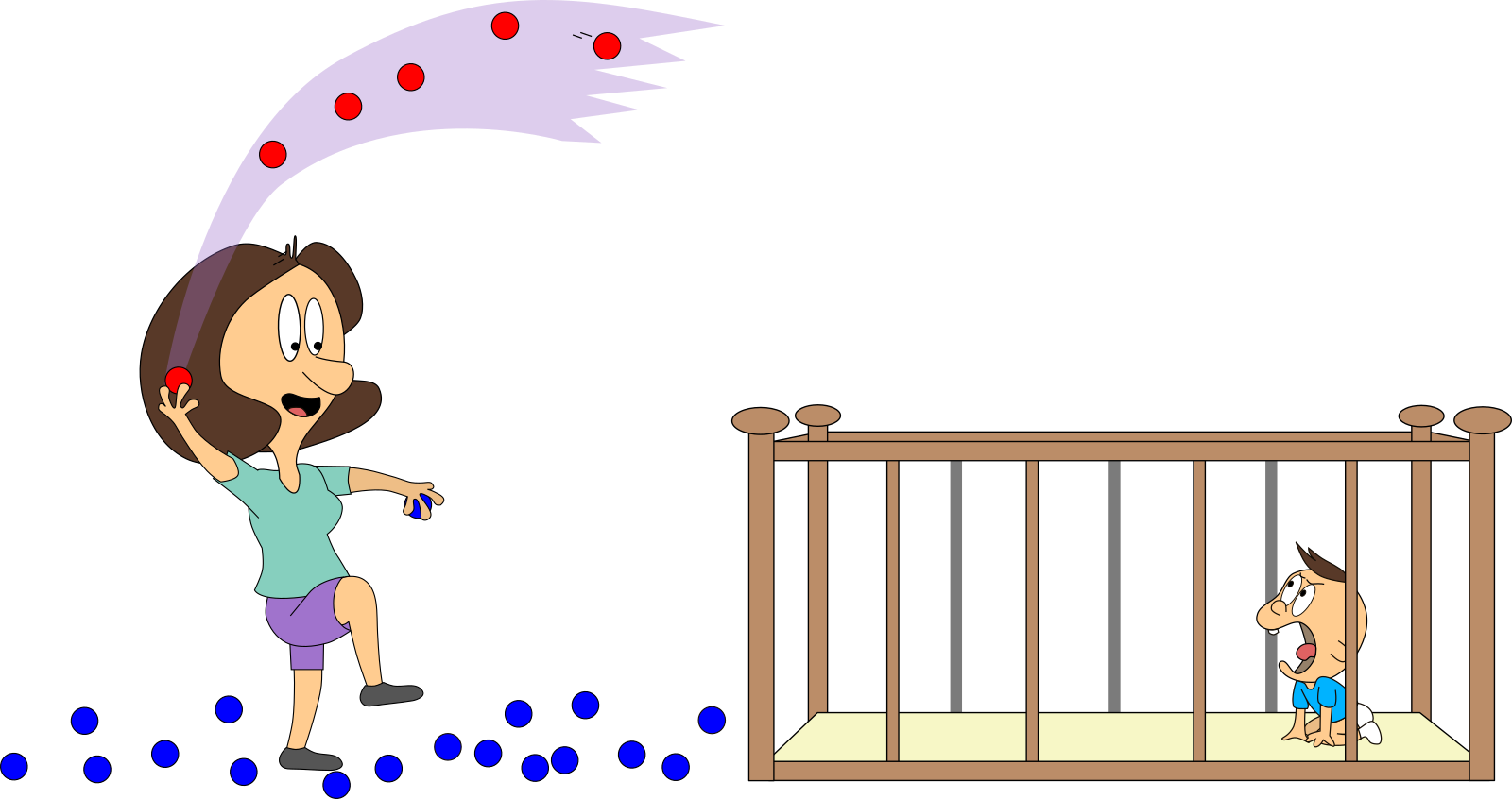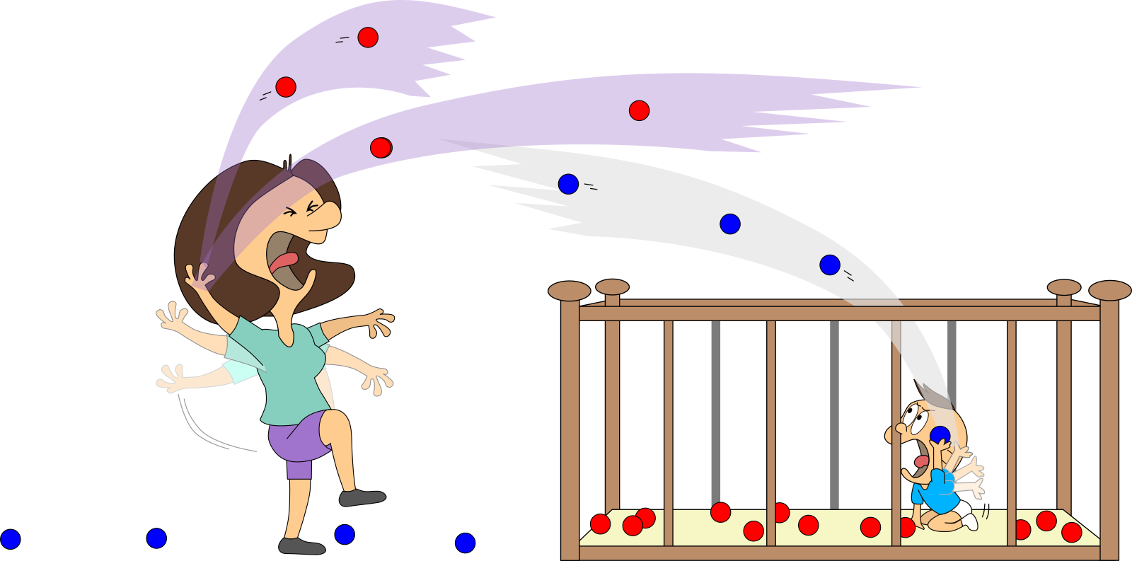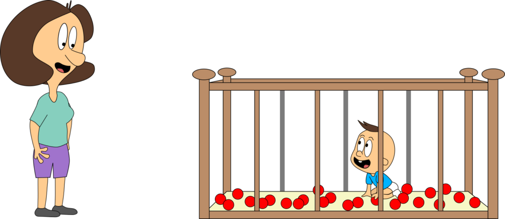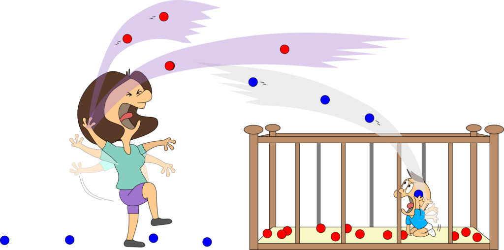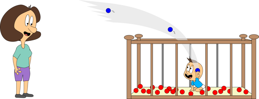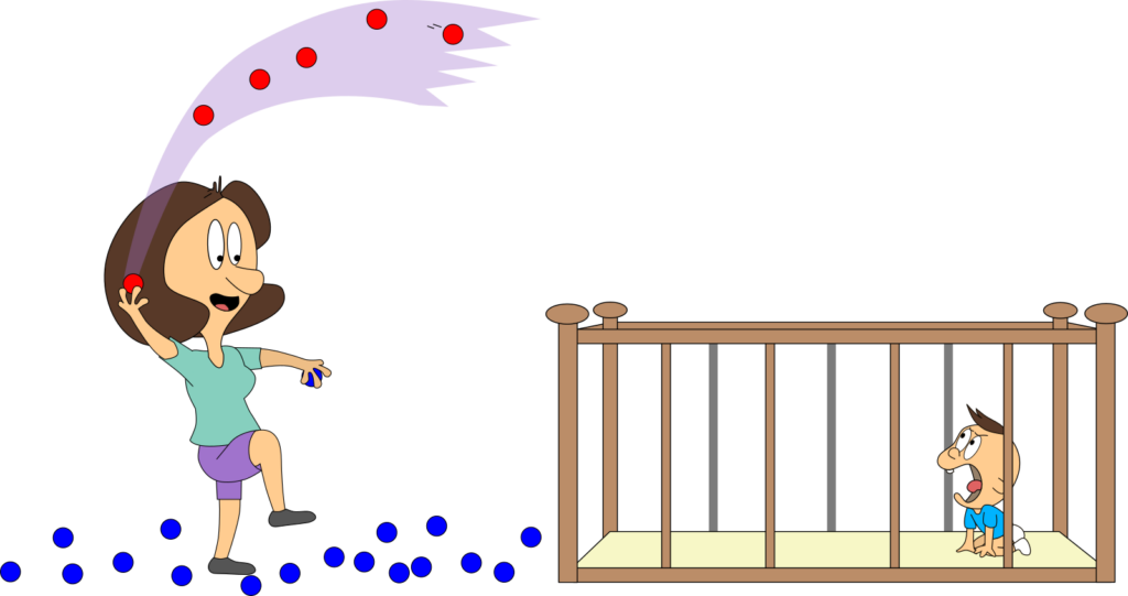 Wir nehmen viele Vereinfachungen an. Mama und Baby werden z. B. nie müde! Aber wir wollen so tun, als ob. Der Raum ist bestimmt nicht nur 1 m³ groß. Aber das ändert am Prinzip nichts, sondern erleichtert uns nur das Rechnen.