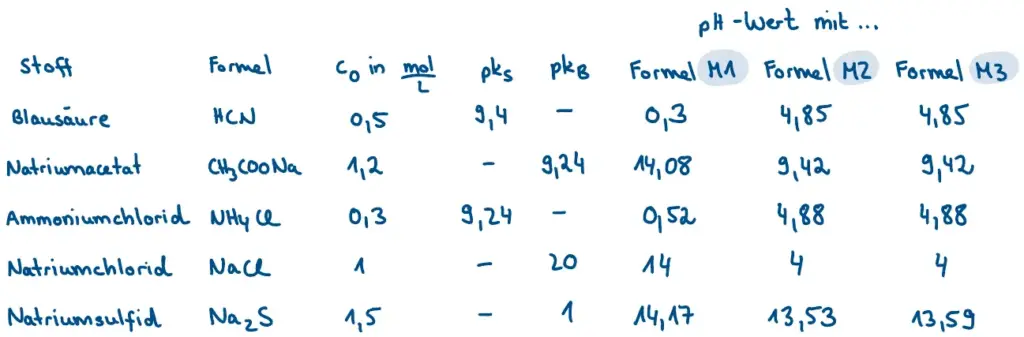 - Benennen Sie eine Auffälligkeit in den berechneten pH-Werten je Stoff in Aufgabe 4 unter der Verwendung unterschiedlicher Formeln und ziehen Sie ein begründetes Fazit.