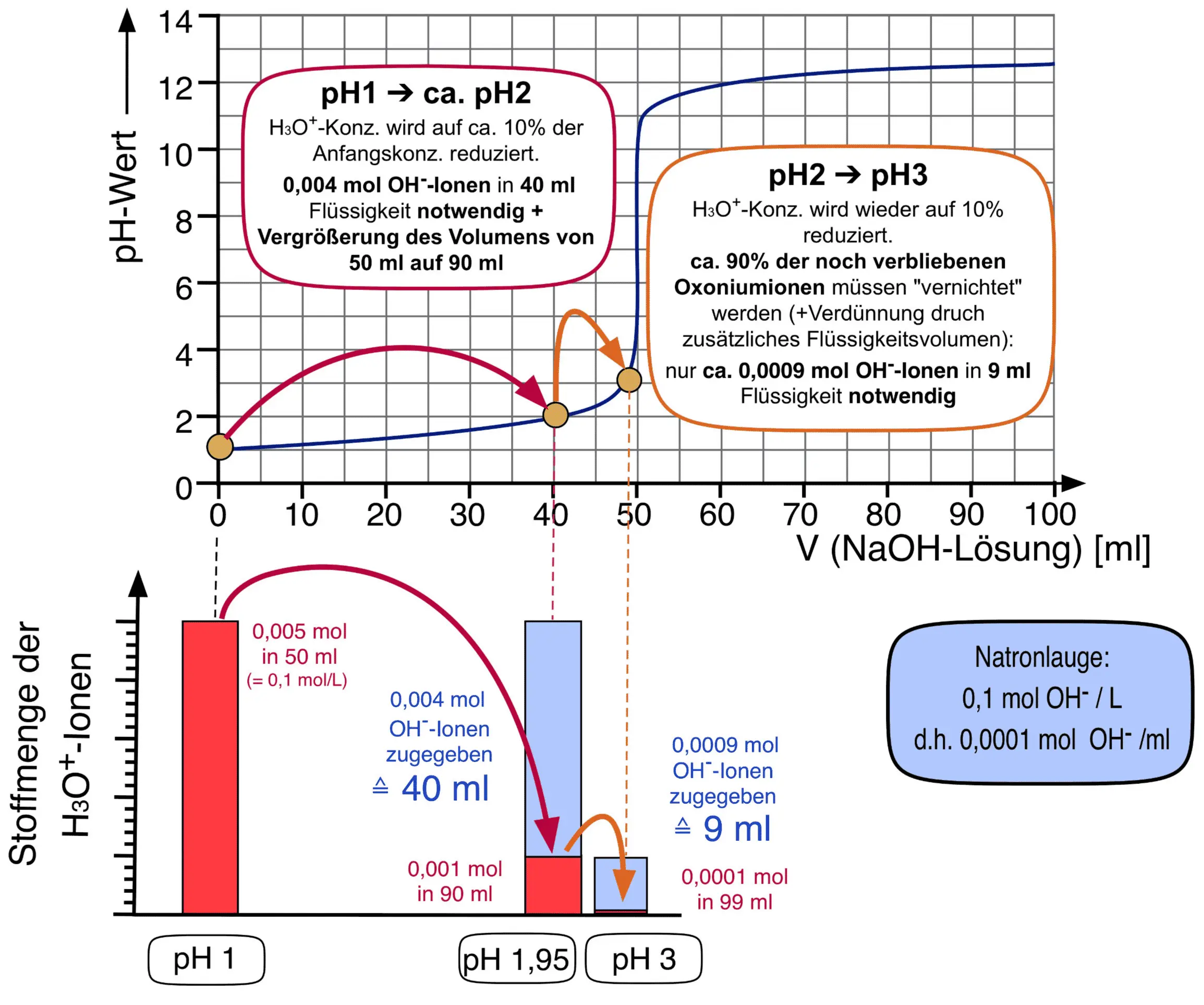 - Für den nächsten Schritt (pH 2 zu 3) muss wiederum die verbliebene Konzentration auf 10 % sinken, was jedoch weniger Hydroxid-Ionen erfordert, da die Ausgangskonzentration jetzt deutlich niedriger ist.