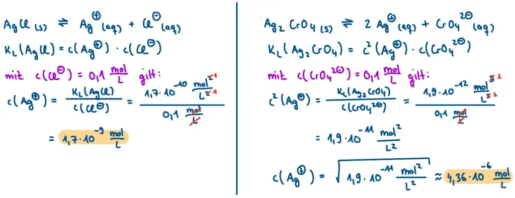 - Eine Lösung enthält 0,1 mol/L Natriumchlorid und 0,1 mol/L Natriumchromat. Fällt bei Zugabe von Silbernitrat zuerst Silberchlorid oder Silberchromat aus?