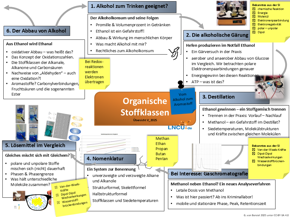 „Organische Stoffe verschiedener Stoffklassen spielen im Leben des Menschen in mehrfacher Hinsicht eine entscheidende Rolle. Neben vielfältigen Anwendungen im Alltag, beispielsweise als Lösemittel und Inhaltsstoffe in kosmetischen Produkten, nehmen sie als Genussmittel oder Konservierungsstoffe auch Einfluss auf die Gesundheit. Ein tiefergehendes Verständnis solcher Zusammenhänge bedarf einer Durchdringung grundlegender chemischer Sachverhalte, auch im Hinblick auf die Ausbildung eines fachlich fundierten Urteilsvermögens. Dieses trägt zur Entscheidungsfindung beispielsweise in Fragen der eigenen Gesunderhaltung ebenso bei wie in Fragen der Umweltverträglichkeit und unterstützt ein kritisches Hinterfragen der Darstellung chemischer Zusammenhänge in unterschiedlichen Medien.“1