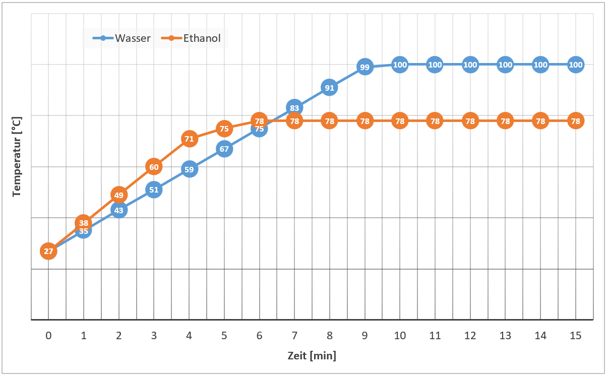 - Erklären Sie, warum die Temperatur einer Flüssigkeit eines siedenden Reinstoffes trotz Energiezufuhr nicht weiter ansteigt.