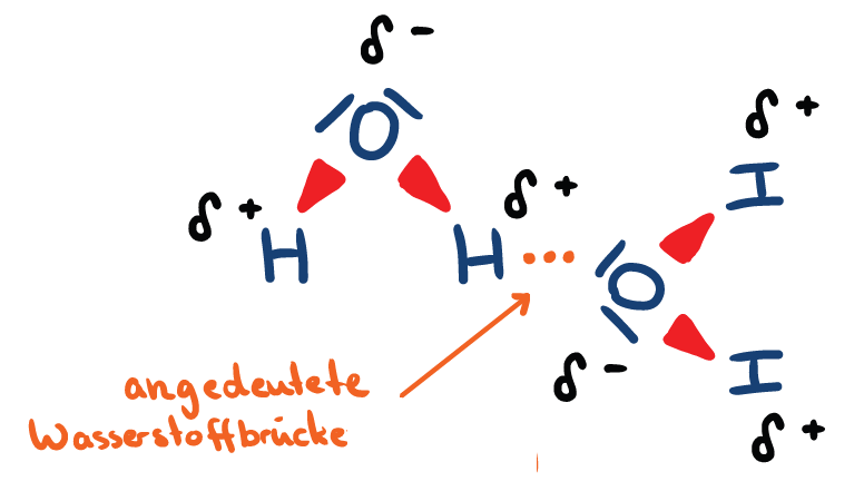 Noch eine Besonderheit: ist in den Molekülen ein Wasserstoffatom an ein besonders stark elektronegatives Atom gebunden, z. B. ein Sauerstoffatom (oder Stickstoffatom), kann es zwischen dem partiell positiv geladenen Wasserstoffatom des einen Moleküls und dem freien Elektronenpaar eines Sauerstoffatoms eines benachbarten Moleküls eine regelrechte „Brücke“ geben. Eine solche sogenannte Wasserstoffbrücke hat in etwa 1/10 der Stärke einer echten Elektronenpaarbindung und ist so gesehen eine besonders starke Art der Dipol-Dipol-Wechselwirkung.