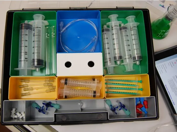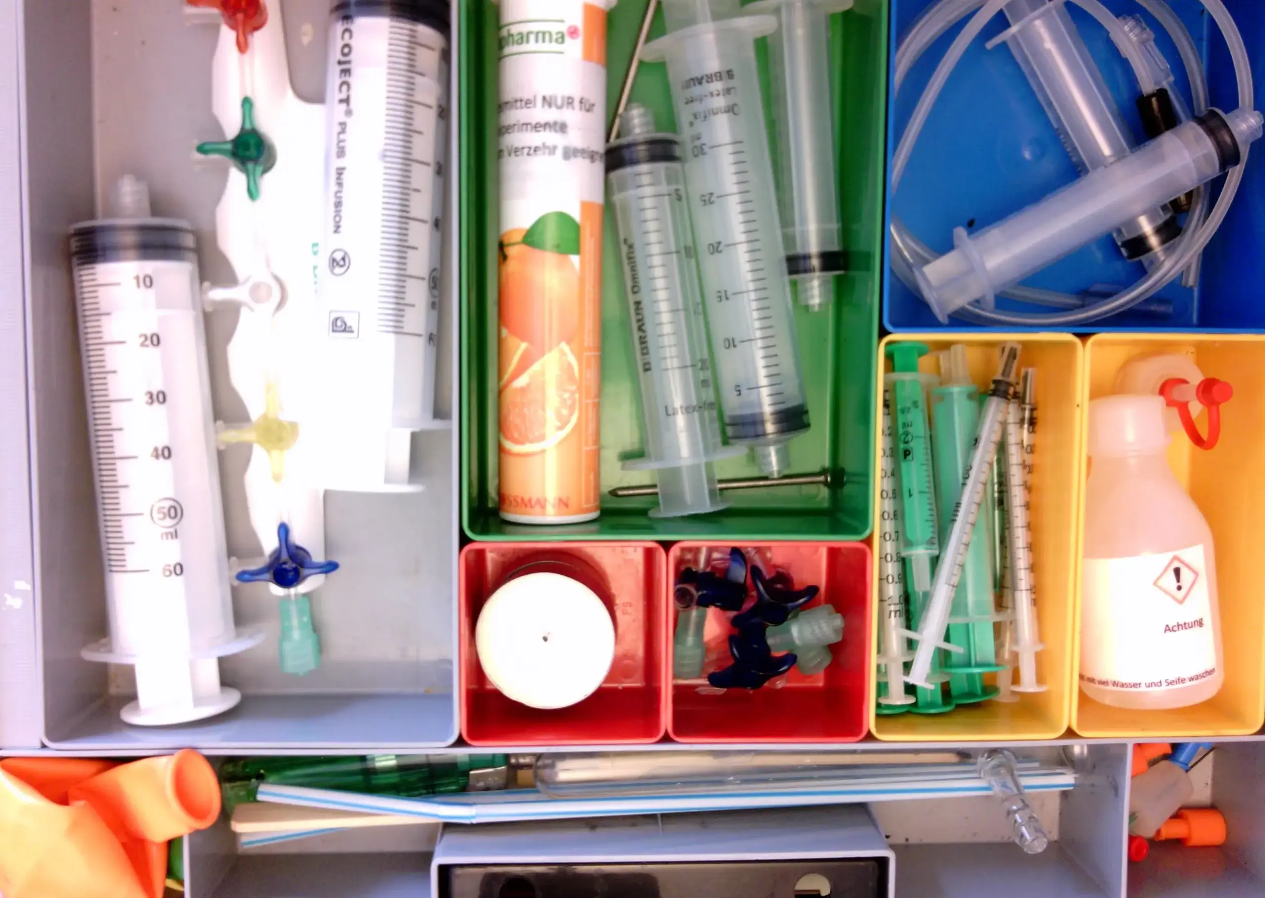 Der Einsatz von Spritzen samt einer Auswahl an medizintechnischen Geräten erweitert die Möglichkeiten des gefahrenarmen Experimentierens vor allem mit Gasen enorm!