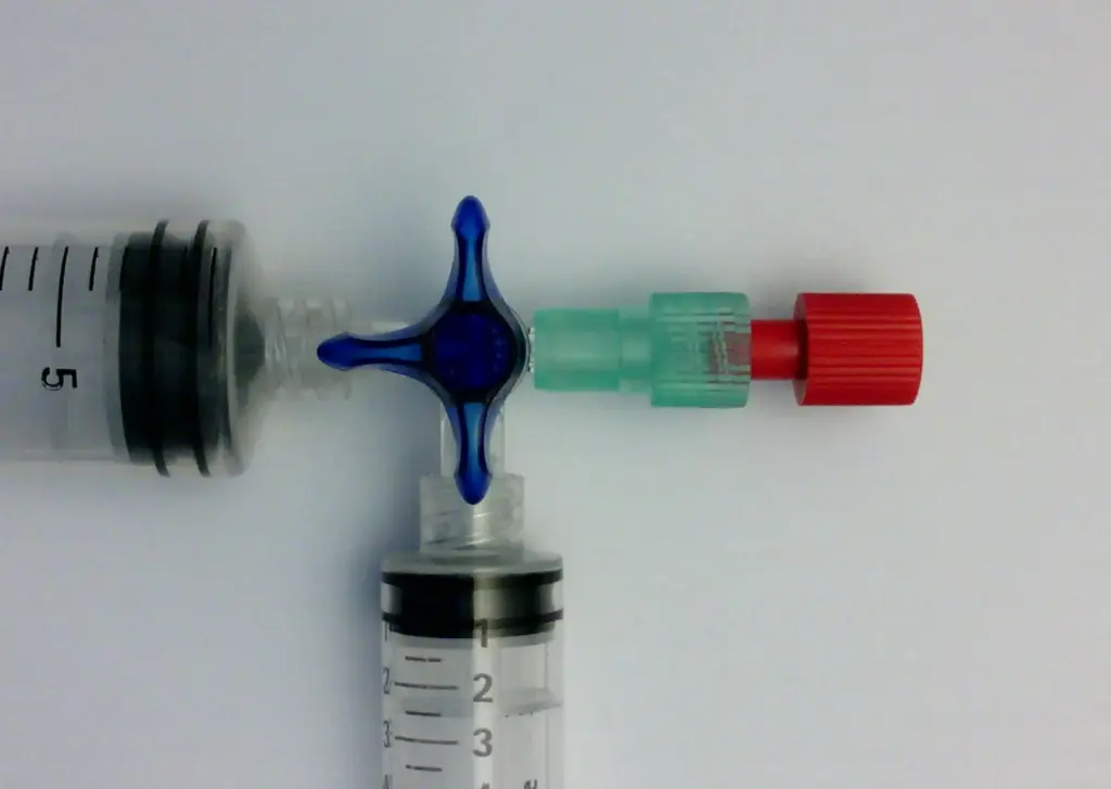 Der Hahn verbindet mehrere Spritzen und macht sie zu flexiblen Räumen, in denen man Substanzen zusammengeben, ineinander lösen oder miteinander reagieren. lassen kann.
