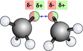 Dipol-Dipol-Wechselwirkung: Anziehungskraft zwischen permanent positiv polarisierten Atomen und permanent negativ polarisierten Atomen.