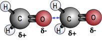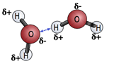 Wasserstoffbrückenbindung: Anziehungskraft zwischen stark positiv polarisiertem Wasserstoffatom (H) und stark negativ polarisiertem O-, N- oder F-Atom. Das Wasserstoffatom lagert sich dabei an ein freies Elektronenpaar des O-, N- oder F-Atoms an (im Symbolbild nicht abgebildet!). Besonders starke Dipol-Dipol-Wechselwirkung