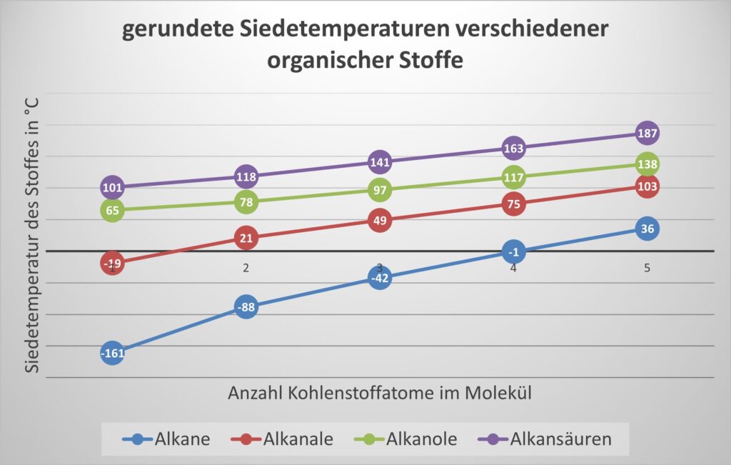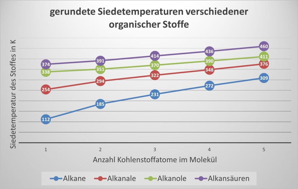 - In Diagramm zeigen sich Tendenzen sowohl bezüglich der Siedetemperaturen innerhalb einer Stoffklasse als auch zwischen den Stoffklassen. Erklären Sie diese Tendenzen mit Hilfe zwischenmolekularer Wechselwirkungen.