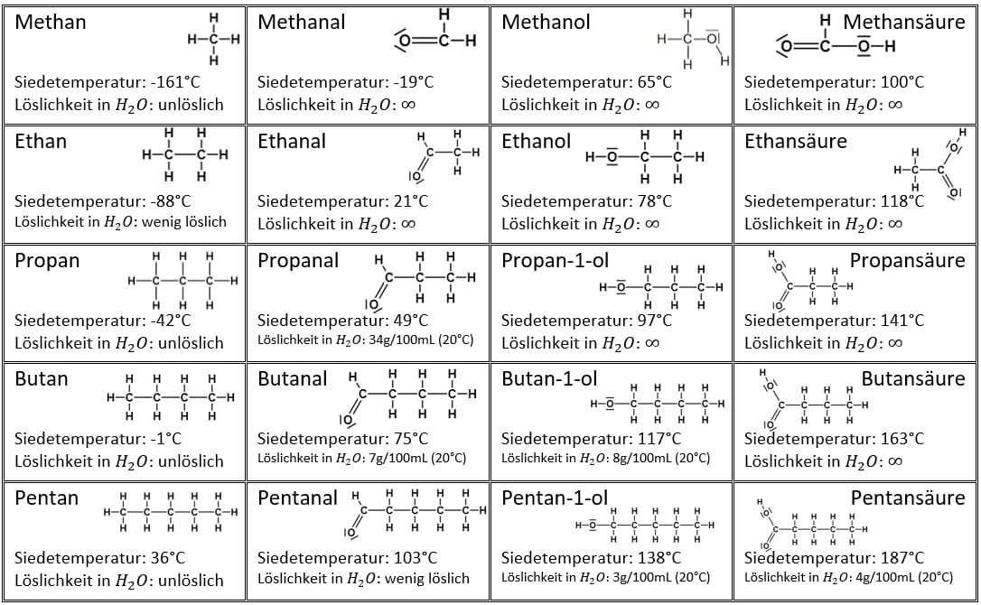 - Formulieren Sie Tendenzen bezüglich der in Abb. 2 angegebenen Siedepunkte und Löslichkeiten sowohl innerhalb einzelner Stoffklassen als auch für Stoffklassen im Vergleich.