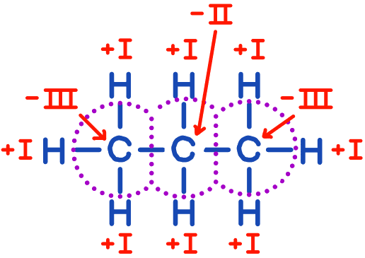 - Erklären Sie, warum im Propan-Molekül nicht alle Oxidationszahlen nur mit Hilfe der Summenformel einwandfrei bestimmbar sind, obwohl das Molekül lediglich aus zwei Atomsorten aufgebaut ist.