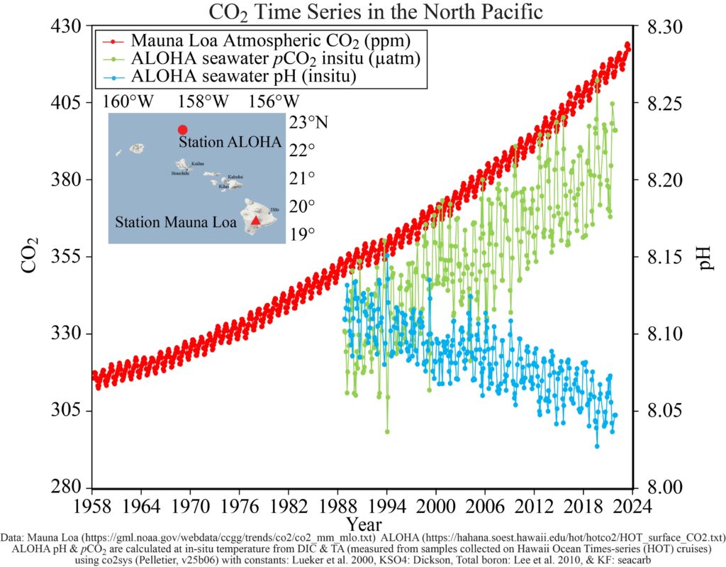 Die Konzentration von Kohlenstoffdioxid im Meer und der pH-Wert der Meere werden u.a. in der 1988 ins Leben gerufenen Station ALOHA der Universität Hawaii gemessen. Die Messwerte für den Anteil von Kohlenstoffdioxid in der Atmosphäre stammen von der nahe gelegenen Station Mauna Loa. Abb. 1 zeigt das Ergebnis der Messungen.