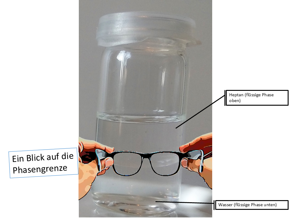 Beide Flüssigkeiten wurden zuvor von der Lehrperson eingefüllt. Das Glas ist aufgrund des Gefährdungspotentials von Heptan verschlossen und muss verschlossen bleiben.